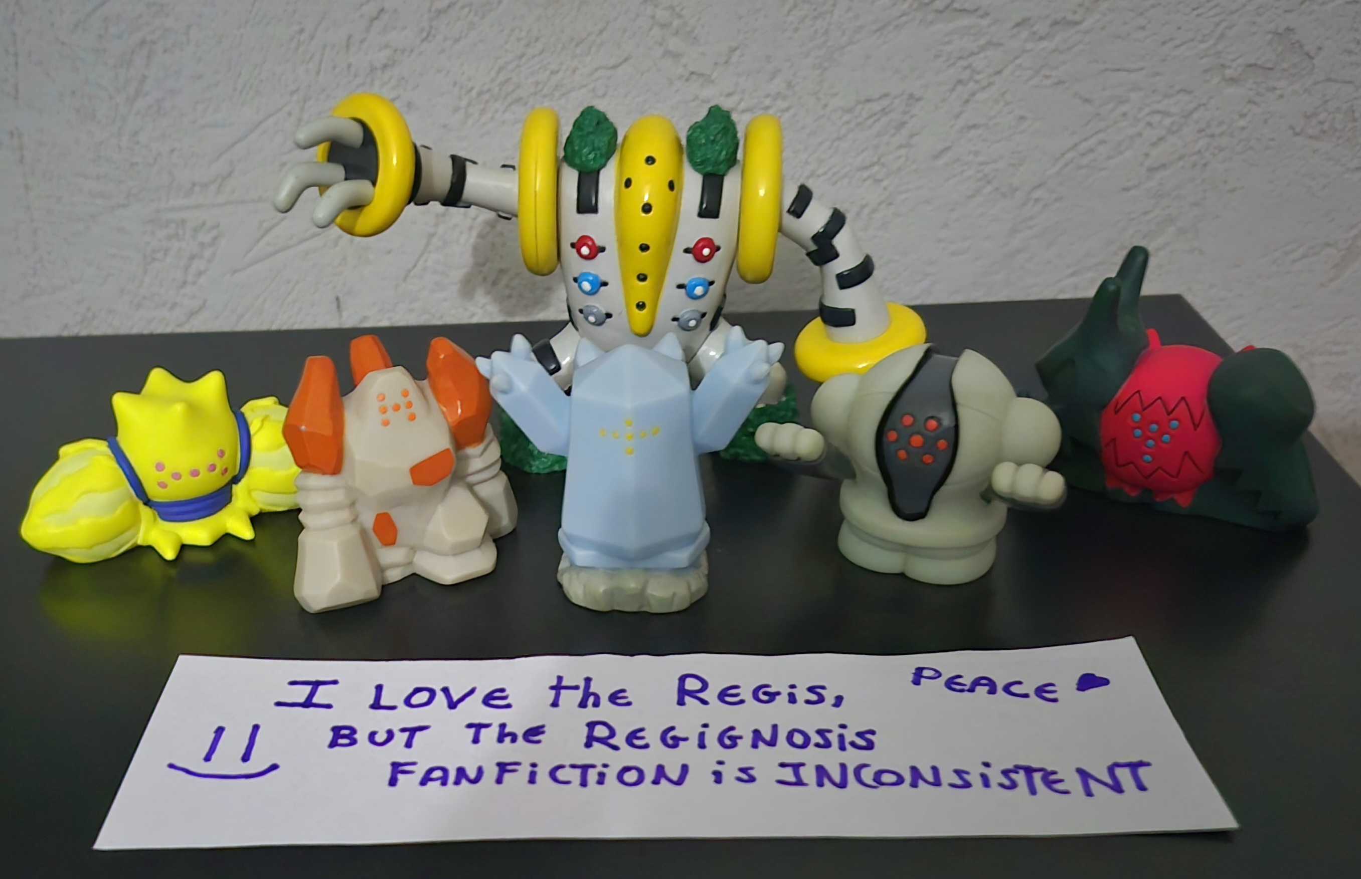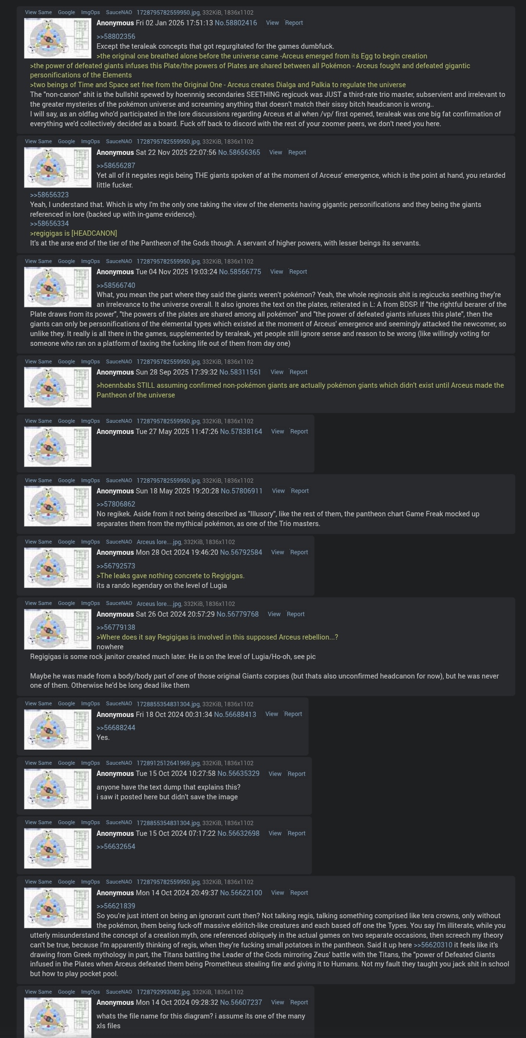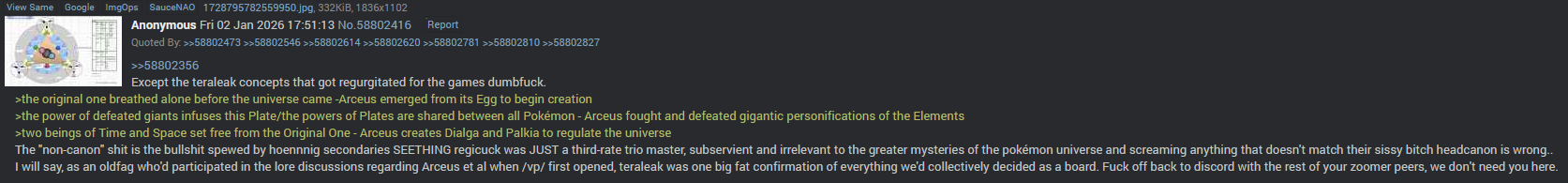 >>58824284What are you talking about? You're saying things I didn't say.I'm saying that the golems are inspired by Hebrew mythology. That's why we have puzzles with Braille text for them. As a reminder, Hebrew golems are inert matter brought to life by being given a mission; in Pokémon, their mission is to protect humans.Besides, you, who earlier confirmed that Golurk is a Hebrew golem, will notice that it also has this kind of lore:Violet Pokédex:>Golurk were created by ancient people to protect both people and Pokémon. They run on a mysterious energy.I never said Arceus created the golems. You're making that up.Arceus only directly created Dialga, Palkia, Giratina, Mesprit, Uxie, and Azelf. The rest are more indirect creations that stem from what its own creations (space, time, matter, soul) have created.I'm talking about Game Freak; they designed Regigigas so that the Regis would have a Trio Master. Just like the Beasts Trio is linked to Ho-Oh and the Birds Trio is linked to Lugia. That's why Regigigas is the creator and leader of the Regis.Regidrago and Regieleki are additions that arrived more than a decade after Regigigas. They don't appear to have been planned during Regigigas' design, which is why he doesn't have the round patterns in Regieleki and Regidrago's colors.The true canon is the games (the definitive and finalized content).Teraleak is interesting for things that remain unanswered, like the diagram and certain ideas. But if an earlier version of the myth contradicts the games—for example, Dialga and Palkia creating Spirit Trio—that would be invalid because the definitive version refutes this: Spirit Trio was created by Arceus. Things that aren't contradicted are still interesting possibilities, but they aren't canonical facts.I won't address Gorochu and other elements you mentioned because that's not the topic.