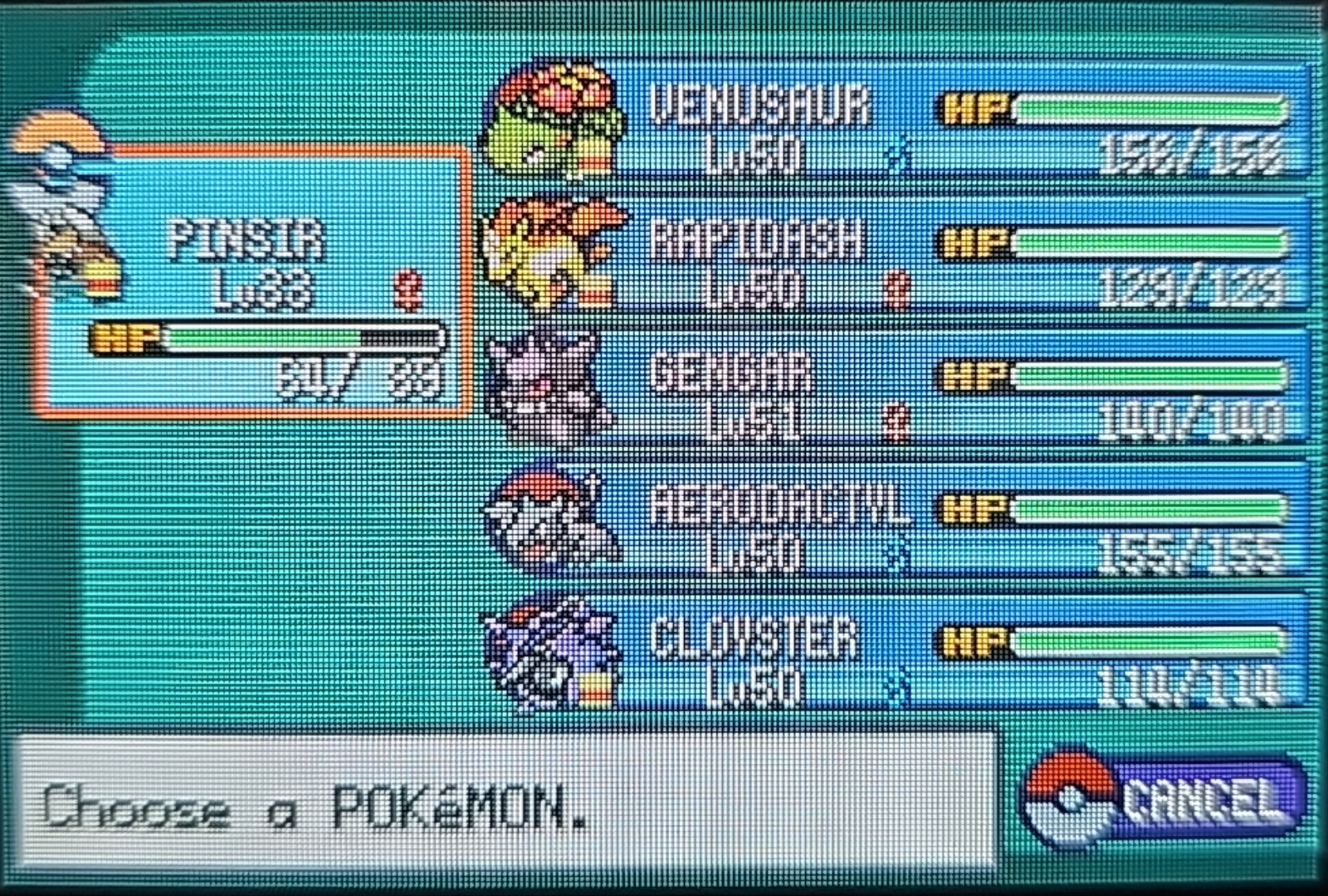 Just finished the Sevii Islands Arc of Leafgreen. I've decided to swap my team ( save for Venusaur and Gengar ) and bring in Hoenn and Johtomons to replace the rest. I've brought in Skarmory and Spheal ( via Egg ) to replace Aerodactyl and Cloyster. I'm thinking of replacing Kangaskhan and Rapidash with Houndor/Slakoth from Emerald/Ruby.