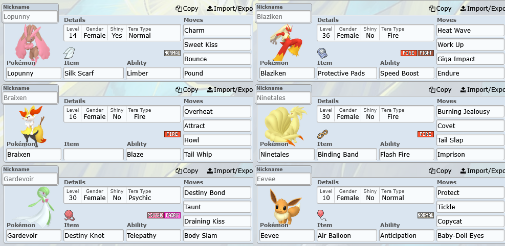As every single pokémon is available through debug mode I decided to play it 9 times with different teams, each with pokémon from one of the 9 generations. Here's my Gen 9 and 8 teams