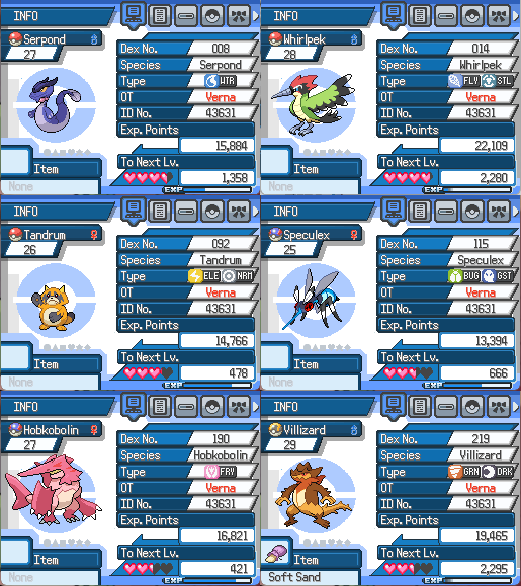 Playing a demo of a fangame called Pokémon Evergreen. Having fun so far. Here's my team after beating the 4th Gym Leader.
