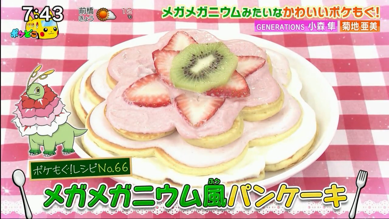>Mega Meganium-style Pancakes>by Hikaru Takahashi, Abareru-kun, Hayato Komori and Ami Kikuchi>Ingredients: 200g of pancake mix, 160ml of milk, 1 egg, appropriate amounts of whipped cream, appropriate amounts of strawberry jam, appropriate amounts of strawberries, appropriate amounts of kiwi>Mix the egg with the milk, then add the pancake mix and stir about 20 times. Put the finished batter in a pancake batter dispenser, then squeeze the batter into a frypan in the form of 7 small circles connected in a flower shape. Cover the frypan with a lid and cook until the pancake is golden. Make three pancakes like this, each a bit smaller than the last. Next, divide the whipped cream into three portions and mix different amounts of strawberry jam into each. Spread the finished strawberry cream on the three pancakes, with the lightest colored cream on the biggest pancake and the darkest colored cream on the smallest, then stack the pancakes with the biggest on the bottom and the smallest on the top. Finally, add slices of strawberry and kiwi in the shape of the smallest flower and Mega Meganium's head.Get cooking, anons.