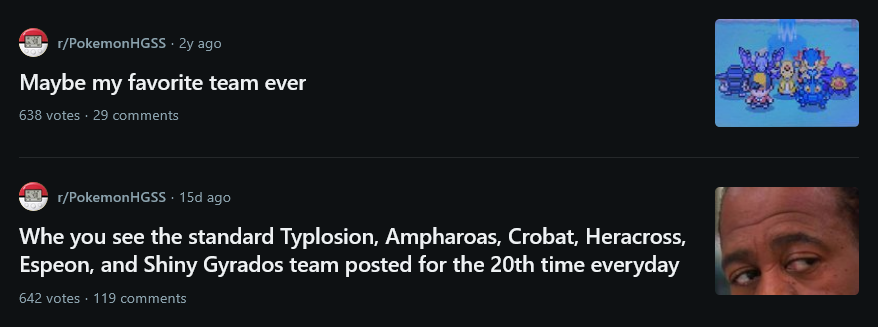 closest anything else gets is the johto typhlosion/red gyarados/ampharos core, but for the other regions it's usually anons reaching for the sake of the meme