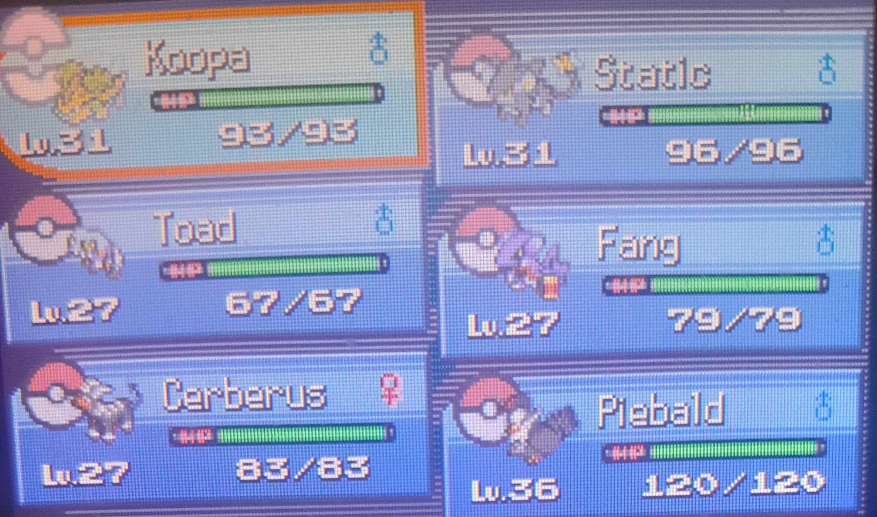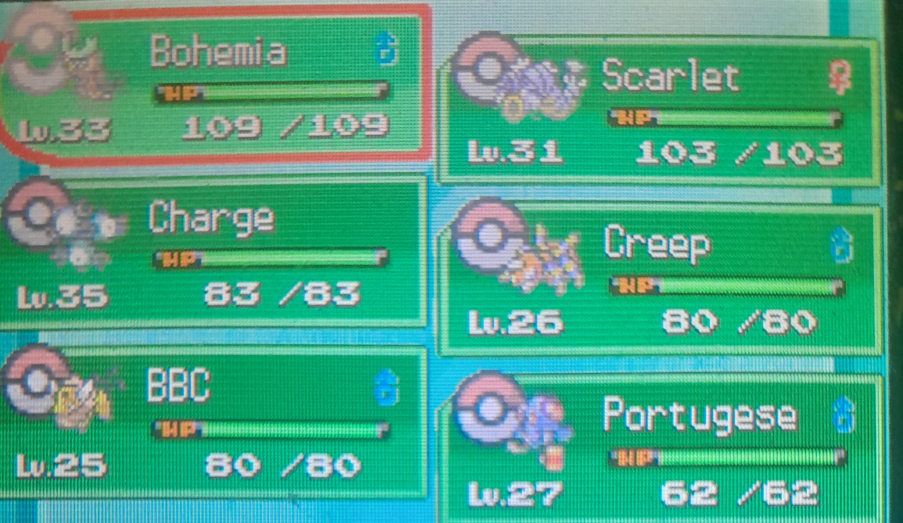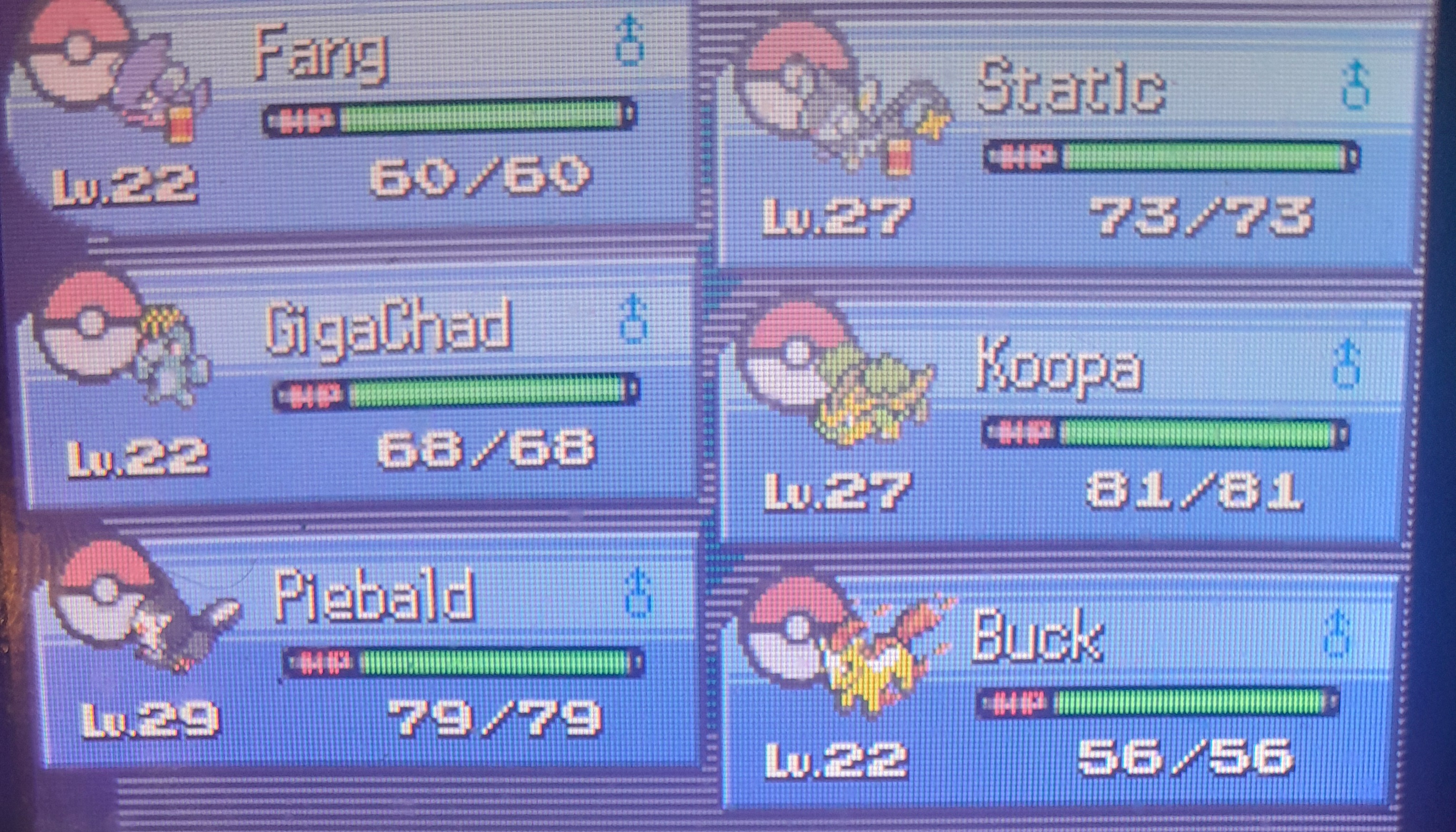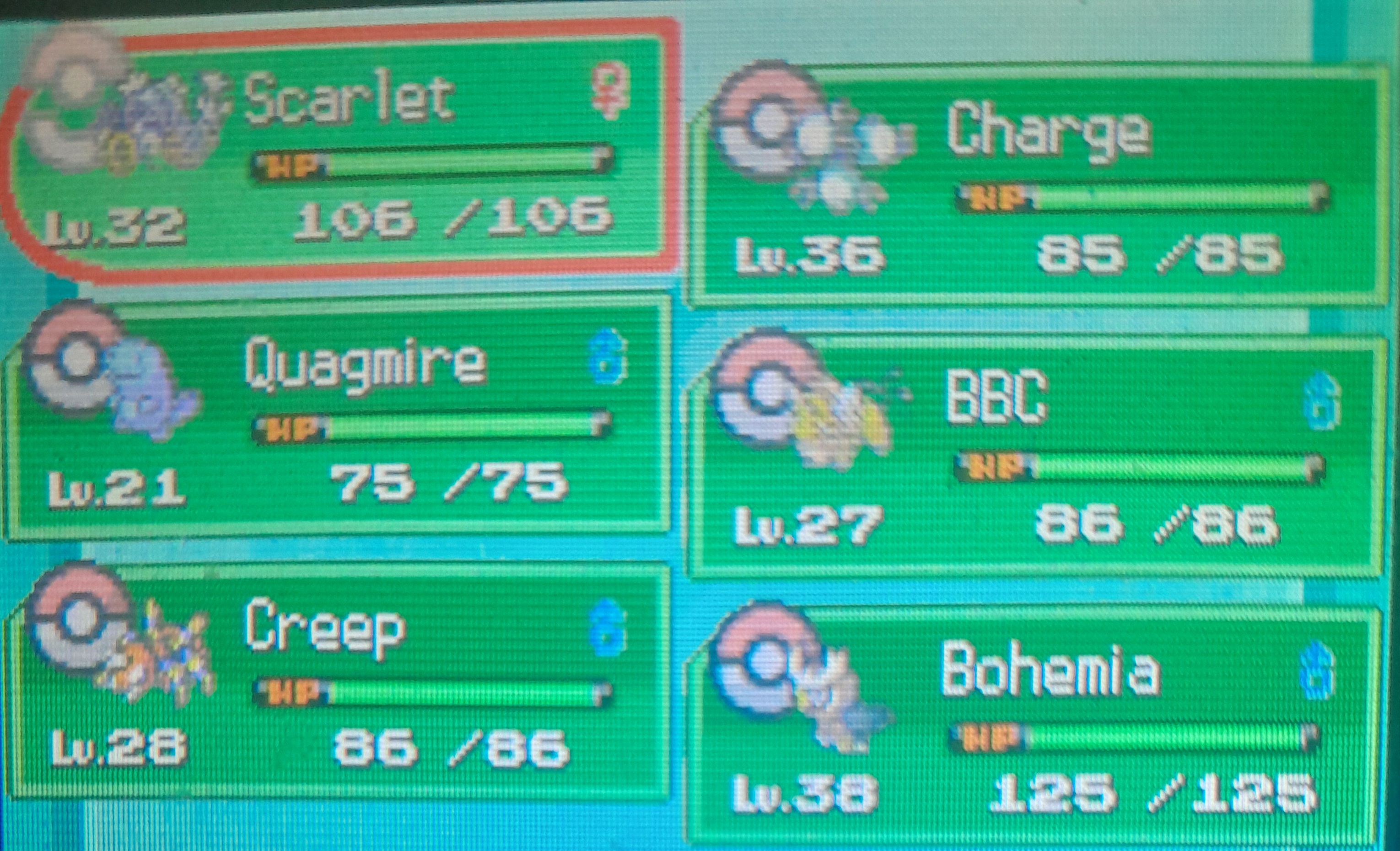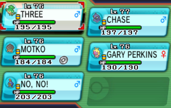 Here are the pokemon that survived. Atleast they got to live and if anyone wants them, just let me know and I will bust out the link cable.My next nuzlocke will be Platinum.