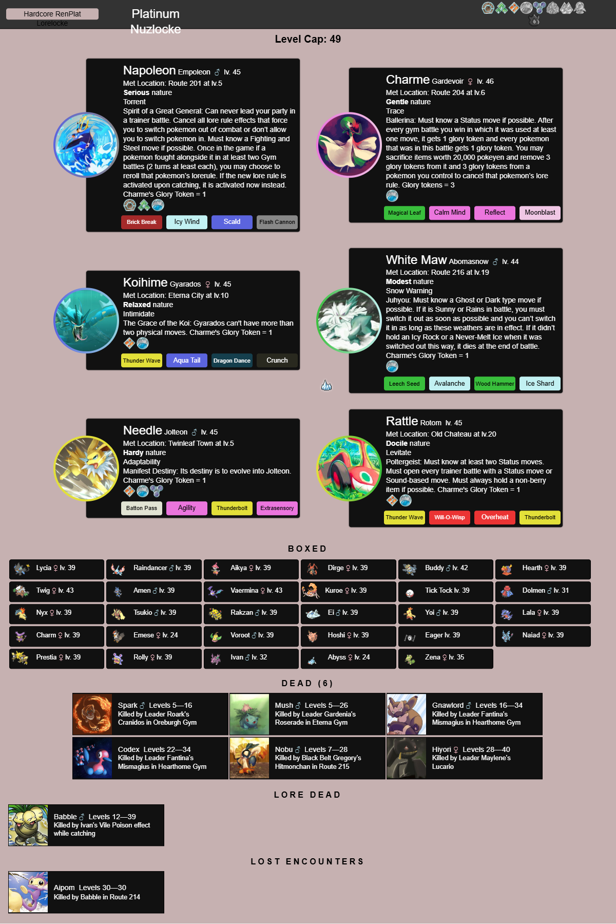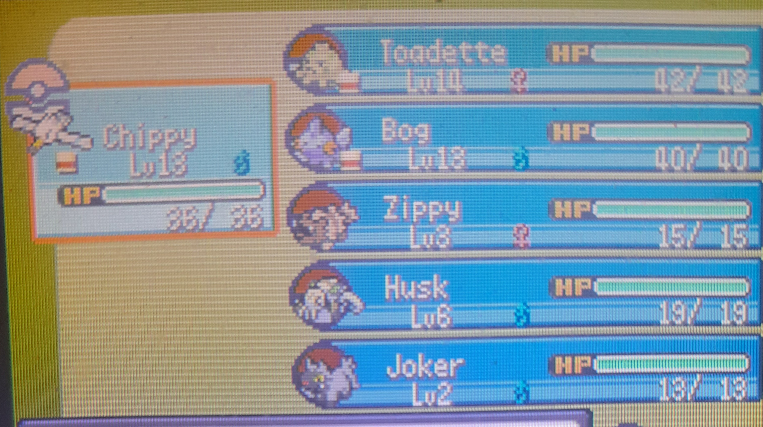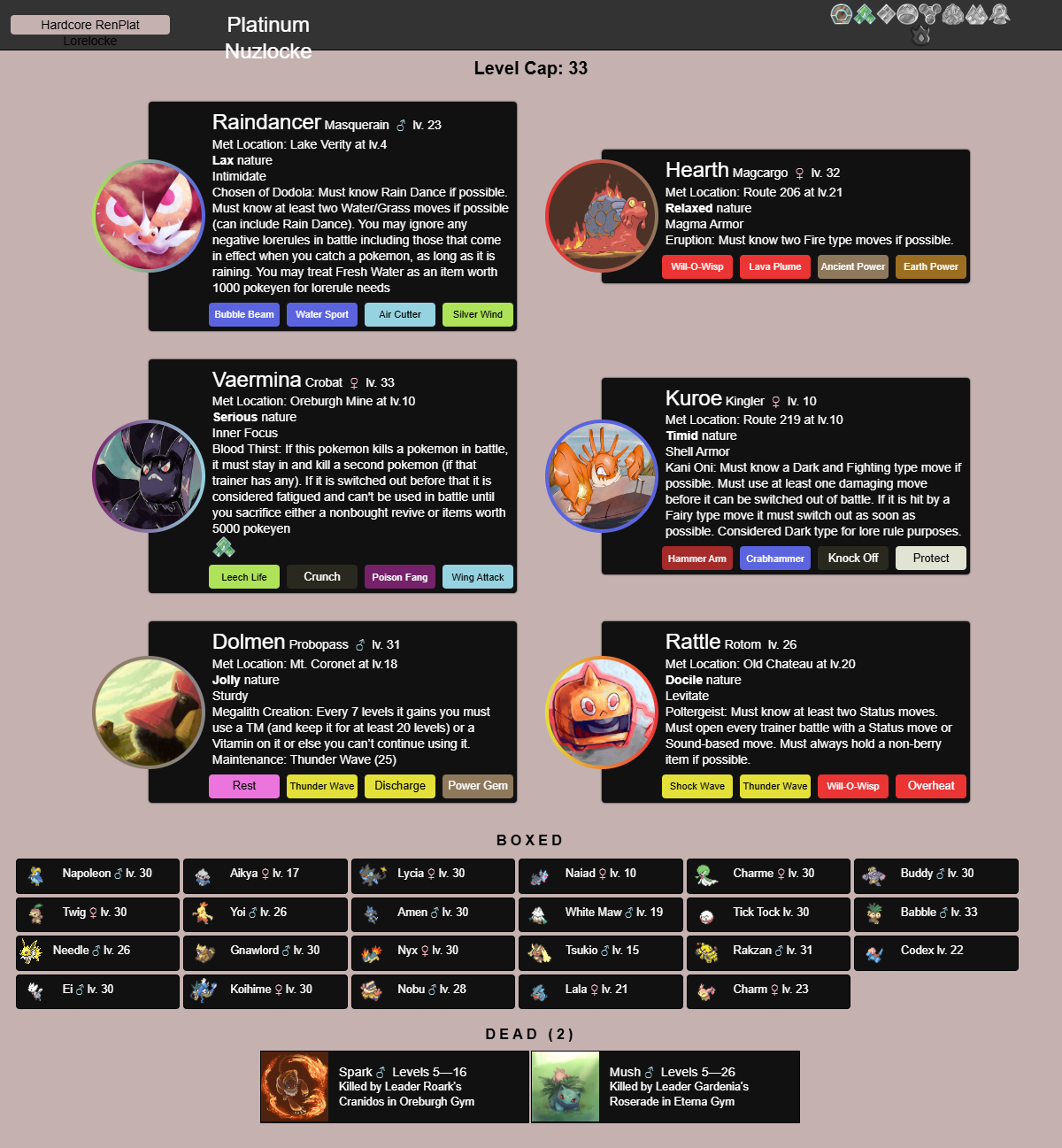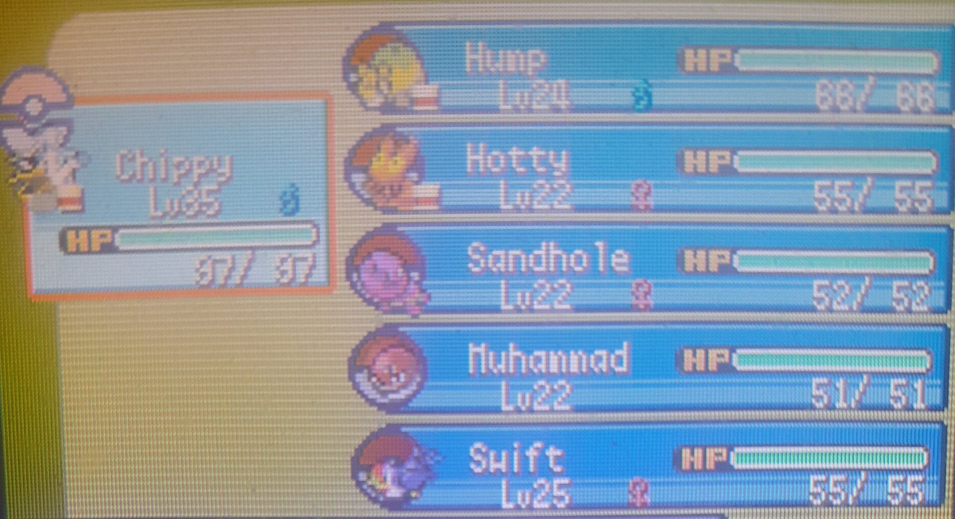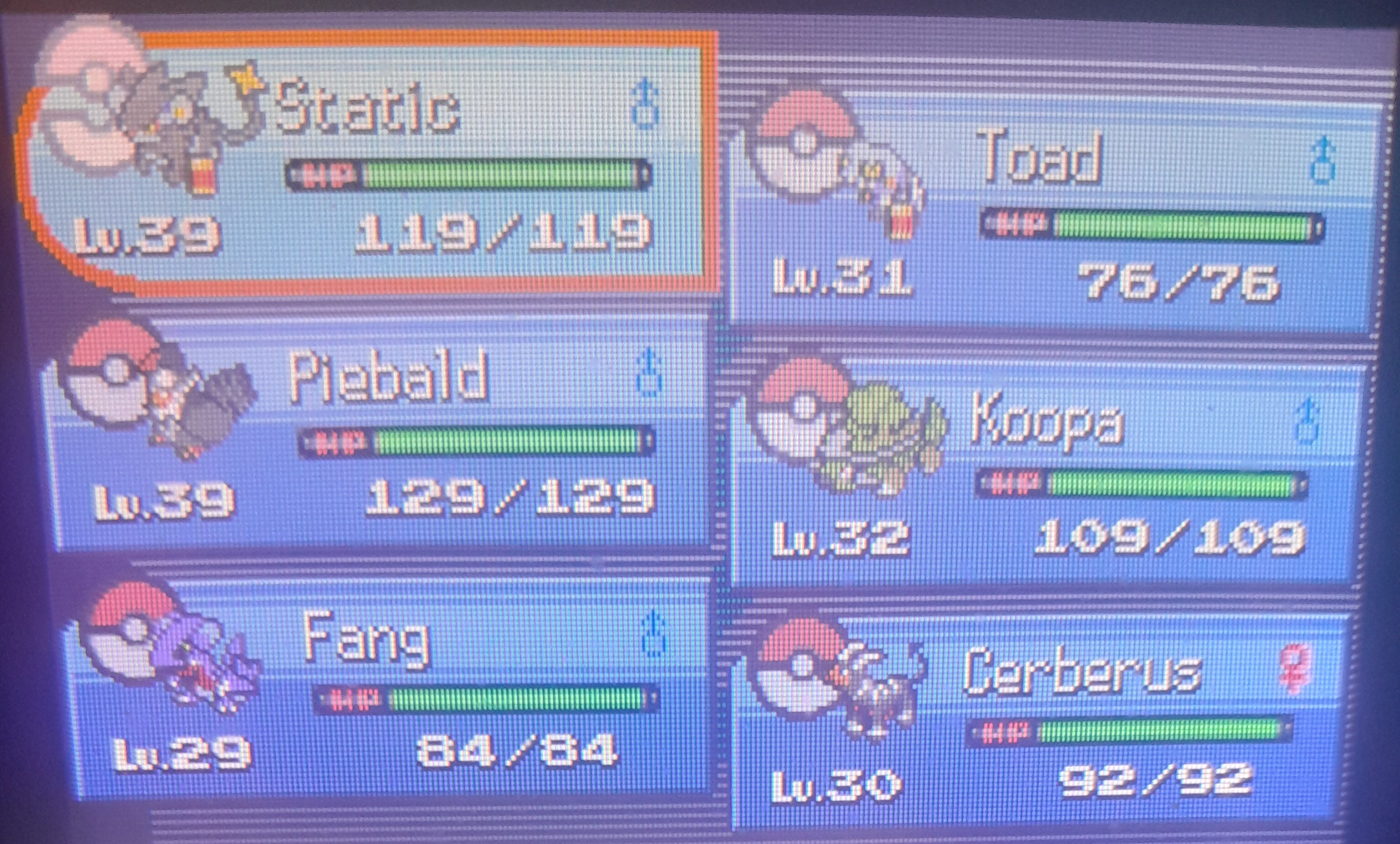 Here are the pokemon that survived. Atleast they got to live and if anyone wants them, just let me know and I will bust out the link cable.My next nuzlocke will be Platinum.