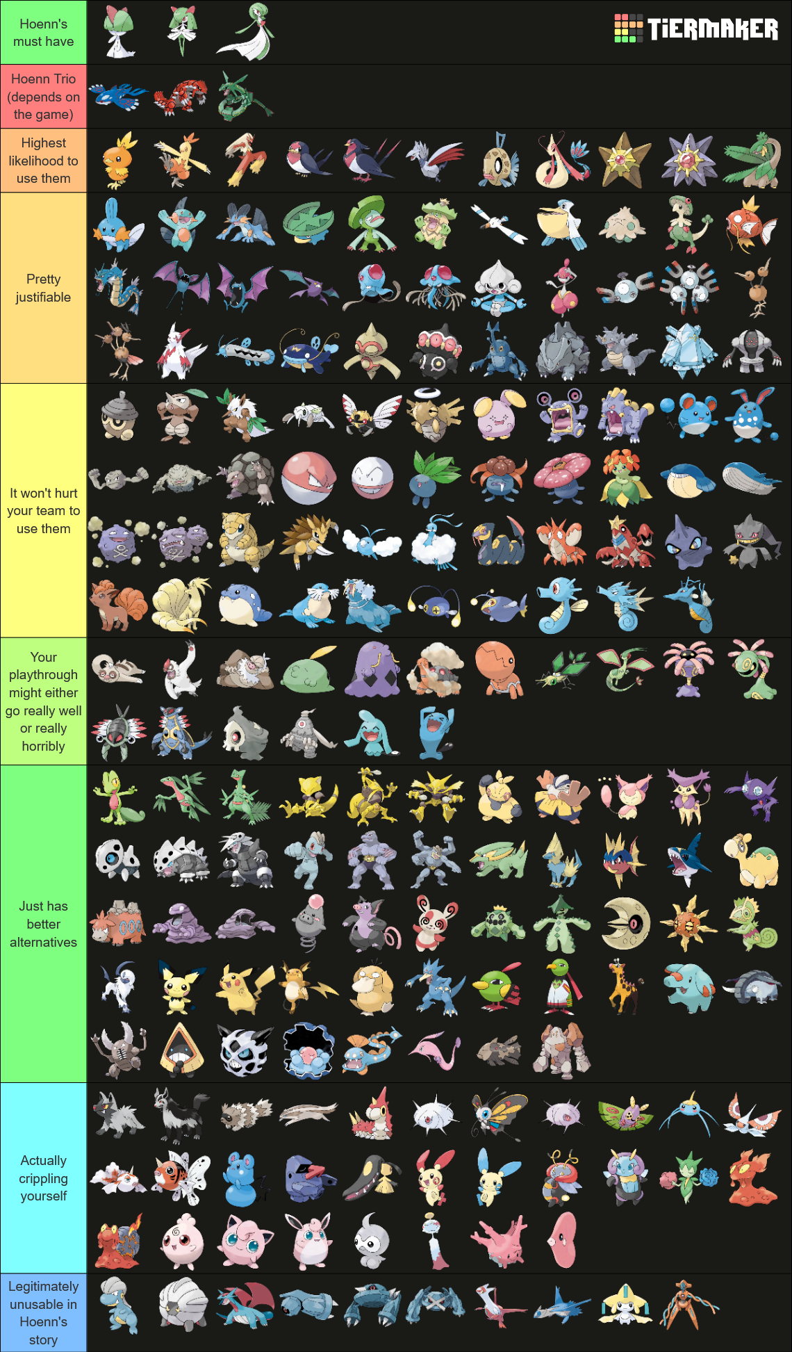 >>58844754Why the fuck are you judging a Pokemon solely based on it's only negative matchups? Bad matchups that aren't even that common besides Water. You have a team with Pokemon that are meant to cover for each other, that's the point.I can kinda see Water types, but what Ground? The occasional Numel or Camerupt you see in like what? 3 trainer teams across the entire game? Flygon's line is rare as shit and I don't recall seeing any trainer using one and Claydol's line's attack is so pitiful that an Earthquake from it is not coming close to one shooting Aggron. You sound like a faggoty uppity zoomoid who's knowledge of Hoenn and gen 3 is entirely derived from jewtubers and shitty romhacks of Emerald rather than the actual game, as I've already said.>>58844755Who the fuck uses Milotic? Do you have any fucking idea how miserable it is to hunt for Feebas? Even more so actually getting it to the point it's maxed out in beauty? Also Starmie is a very late game Pokemon, it's a very competent Pokemon and I like it, but who the fuck is going to wait until the tail end of the game to use one? I also don't recall seeing many people using Tropius ever.>Almost post-game legendaries like the Regis being put that high>While Salamence is considered unusable because you can only get it right before the elite 4What? What the fuck is this list? Who the fuck uses the Regis on a standard Hoenn run?Also Medicham is not present in Emerald, which is typically the version of gen 3 most people play.>Hariyama that lowI'm not it's biggest fan, but for a Pokemon that evolves that early, with stats that huge and a fairly decent movepool, it's not right to put it that low from experience.