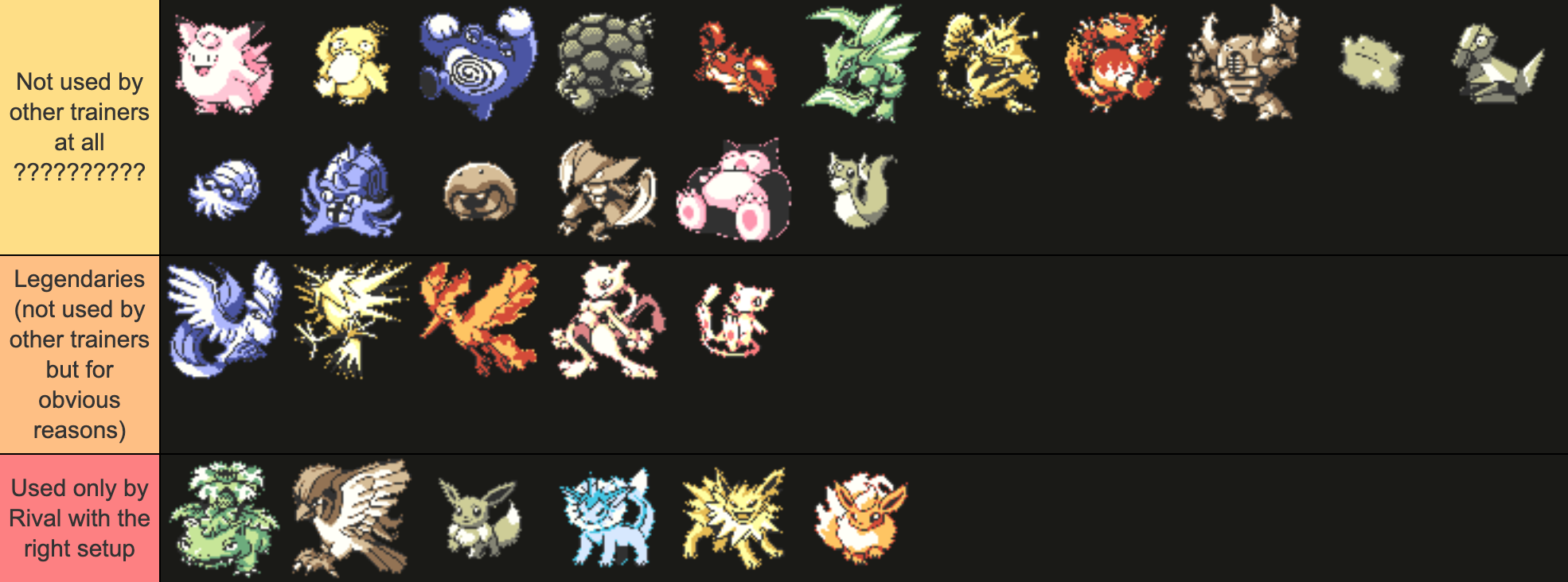 In the Gen 1 Kanto games (IMO the only canon Kanto games) the following Pokemon are not used by any Trainers in the game. See pic related. The Legendaries make sense, so we don't need to talk about those. The Rival only uses Venusaur if you pick Squirtle, and many would argue this is the non-canon starter choice for Red. He uses Pidgeot in RGB but NOT in Yellow, which many would claim is the canon version due to Red's team in GSC. He uses Eevee and its Eeveelutions in Yellow, but we have never gotten any clue as to which form is canon. Outside of this, no other trainer in the game uses these Pokemon. The top rows of pic related are Pokemon that NO NPC uses in-game. But why? What’s up with Golem? Alakazam, Machamp and Gengar are all used by other trainers, so everyone in Kanto knows that trade evolution is a thing. You mean to tell me that not a single person has evolved their Graveler this way? Hm... Clefairy is rare, sure, but trainers do use Clefairy + Nidoqueen, Nidoking, and Wigglytuff, so Moon Stone evolution is clearly known. That excuse fails. There is a trainer outside of Celadon that has a Poliwrath, but for all we know this might be a non-battling Poliwrath. Outside of him, there are no trainers with a Poliwrath. Porygon is available to all in the Game Corner, though that is a hard one to obtain so understandable. There's a girl in Mt. Moon that tells you she's looking for fossils she's heard about. Then you get either the Dome Fossil or Helix Fossil later. There is no evidence to suggest that these are the ONLY fossils in the cave, and the Cinnabar Lab is known for restoring fossils, so other trainers would surely have the fossil Pokemon as well? There being two Snorlax confirms that more Snorlax exist, so no reason there either. But even with all of these possible answers, I cannot think of a single reason why no other trainers would have Psyduck, Krabby, Scyther, Electabuzz, Magmar, Pinsir, Ditto or Dratini.
