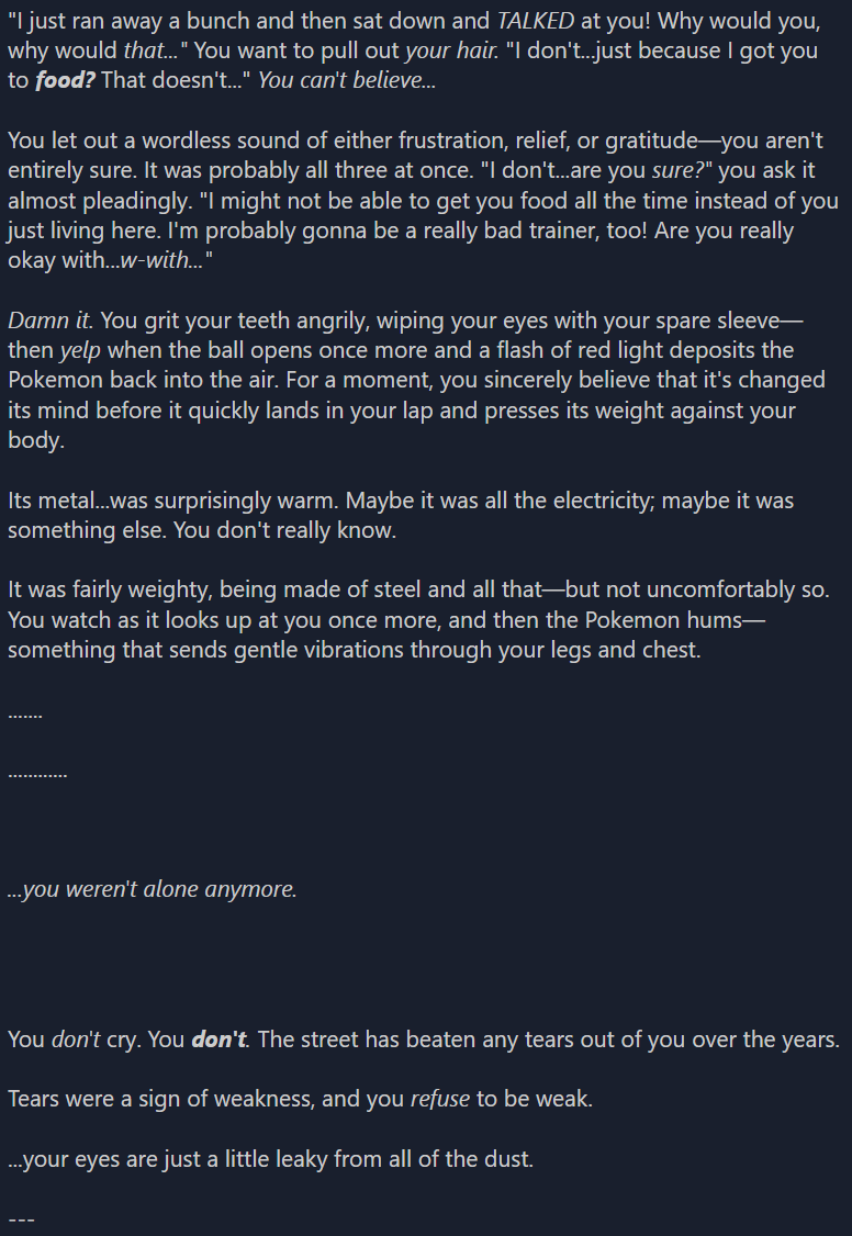 >>58860688>(continued)anyway it got to the point where I basically hit my limit for improving it myself or getting anything useful from AI and released it, then there were things that anons caught while reading that I had to change that I didn't catch or think of myself. so honestly I am pretty surprised that it sounds like AI because I did a lot to rewrite/add/do as much as I could to make it my own + replaced a lot of the AI ideas/parts with completely different things. Rookie wasn't thought up by AI, I came up with that character. what AI did come up with actually was Foster, but I fleshed him out a bit more. also, even though I knew I wanted the flashback to be how it was and came up with it, the AI actually did come up with the name for Kano which I thought was good because it matches Cinnabar (like volcano) and it's the name of a Mortal Kombat character and I'm a big MK fan kek because I got an MK game at a very young age, actually before Pokemon which I got when I was 6. The plot, setting, zubat, how the characters act, little details that connect it to the games, Red's role, how it was written, explanations of stuff, what's referenced, Rookie being new and partnering up with Jenny and Growlithe, very nearly all of what happens and more were all me.it's definitely completely different and not at all written how it was as the text adventure and the vast majority my own ideas and what I wanted. I used my own words as much as I possibly could or think of for literally the whole story by this version. but it wouldn't have even existed to begin with without AI.