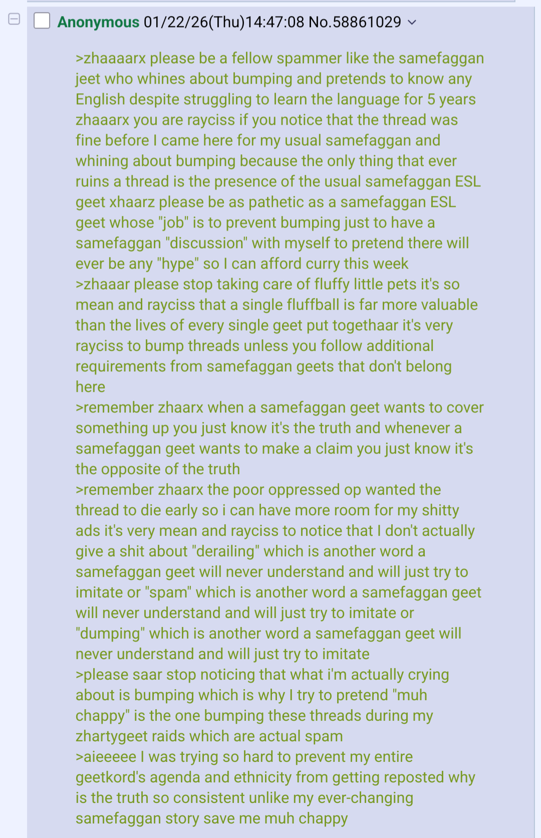 the "XAAR I'M A SAMEFAGGIN JEET" spam isn't high quality by any means