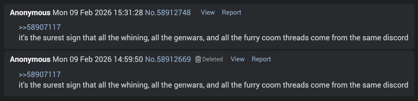 >>58907117it's the surest sign that all the whining, all the genwars, and all the furry coom threads come from the same discord