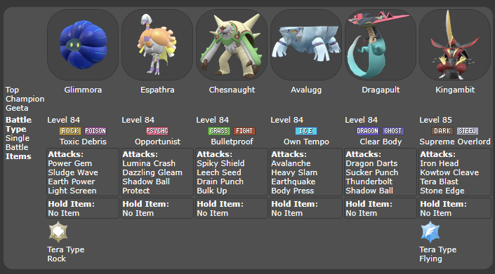 >>58873018>Rika has Camerupt>Poppy has Steelix ( in Masters)>Larry has Staraptor>Hassel has Baxcalibur>Geeta has Glimora I think that there is a world where Legends ZA or its DLC let you battle them with stronger teams. Either that or they're saving their Mega battles for a cameo in Gen 10 kind of like how Cynthia and Mega Garchomp cameoed in Gen 7