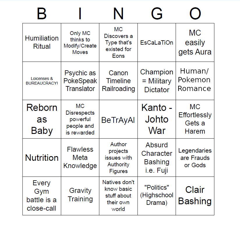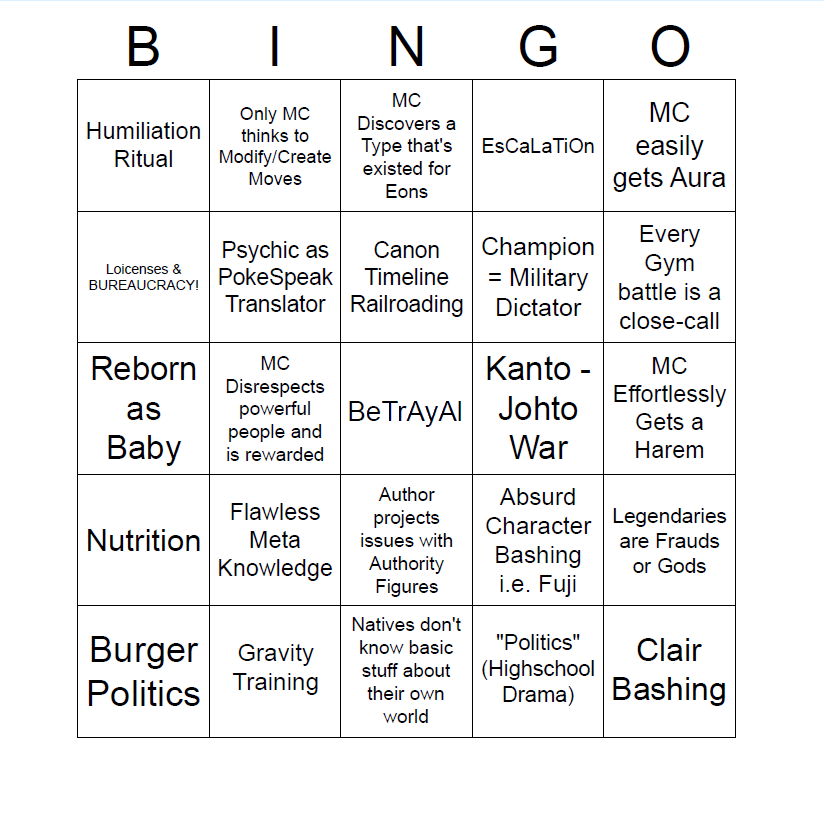 >>58874538It's what the original guy had on there, although I wouldn't replace licenses. I see politics as more like.>You are courting death by defying the Legendary Blackthorn clan!Instead of just bureaucracy. Maybe something like pokemon/human romance would be a good replacement?>>58874591What fic?