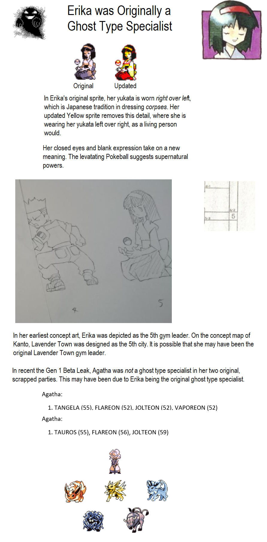 >>58885286Erika's original sprite had her kimono folded in the style of a burial, her eyes were closed, and a pokeball looks like its floating in her hands. This was later changed in Yellow version, the closed eyes explained as Erika being a very sleepy person, and the pokeball just sorta ignored. There is a theory that Erika was originally supposed to be a ghost type gym leader at some point in pokemon's creation.