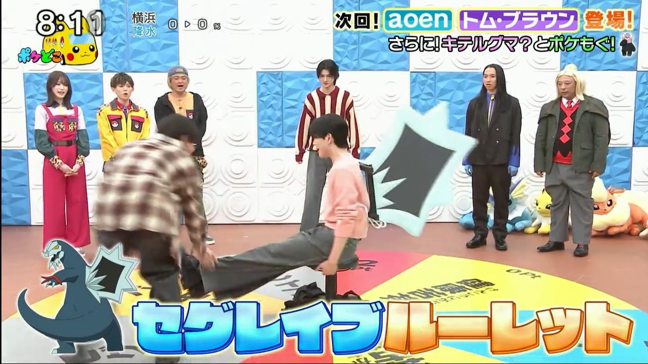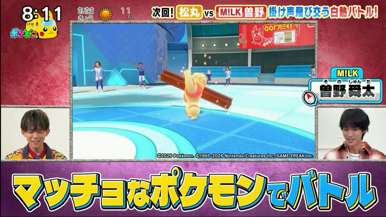 Next week:>"Nunodaka"? "Missaku"? Tom Brown and aoen, alongside their leader AVA(?!), take part in a Seglaive Roulette Challenge.>We'll also get Kiteruguma-style chocolate brownies, perfect for this season!>Summary:>Believe it or not, today's battle in the Pokédoko Battle Club is a "macho Pokémon only" battle between Matsumaru and Sono!!>Cast:>Ryogo Matsumaru>Hikaru Takahashi>Abareru-kun>Shuhei Nakano from Kaerutei (voice of Koccar)>Guests: Tom Brown, Yuju (aoen), Gaku (aoen), Hikaru (aoen), Tomoharu Shoji (from Shinagawa Shoji), Shunta Sono (from M!LK) and Daichi Shiozaki (from M!LK)DONMISIT!