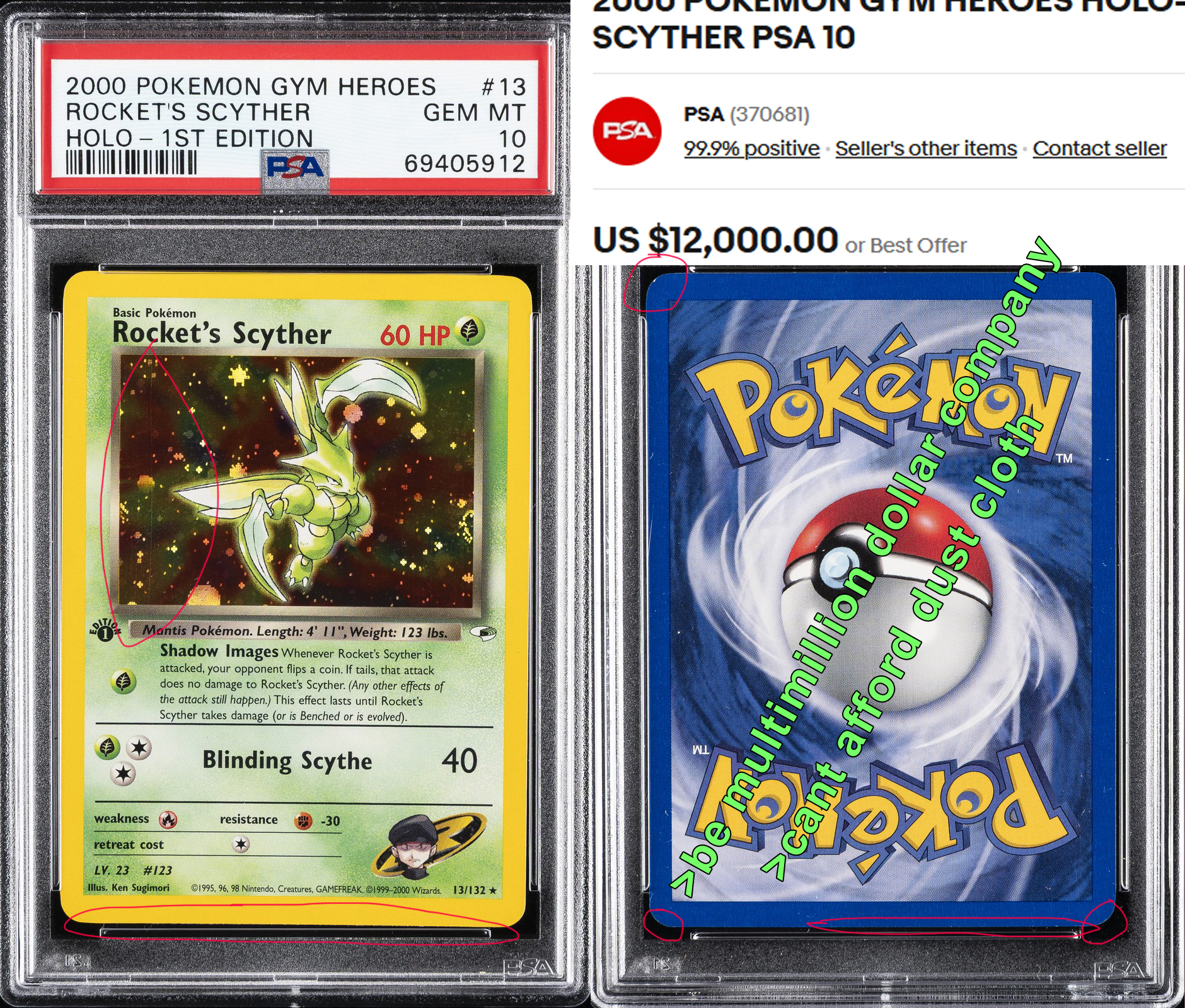 >>58920319>difficulty to acquire.You've said this a couple of times now. I have no clue where you are basing this off of. PSA1s are manufacturable. You can create them. >if you intentionally damage a card it will be rejected and returnedThis is impossible to catch because it is indistinguishable from regular wear and tear. How can you tell if a crease was placed across a card intentionally or not? What if I forgot it in my pocket accidentally? You cannot tell if I swiped the edges of a card on pavement until they ran white. All card damage is done by human hands, regardless -- whether intentional or not. You can buy a cheap PSA2-4, bust it out, and add just a little more wear on it to resubmit for a psa1. Anyone buying or supporting PSA1 collecting is a fraud, charlatan, or delusional. Stupidly supporting a false idea, or immorally scamming others, or coping by trying to own something "unique" and valuable because they're priced out of PSA10s and don't believe there is value in 8s or 9s.