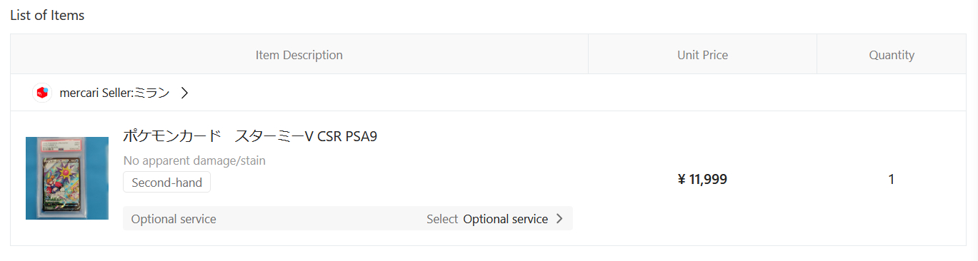 >>58921223>>58915628Continuing my japanese proxy buying experiment.Both of those is from Buyee, pic is Doorzo; an $80 PSA9 Starmie V CSR from Battle Region set.Their exchange rate is soo much better, almost 10% diff compared to Buyee. Honestly not a good time to buy due to CNY, but we'll see how it goes.