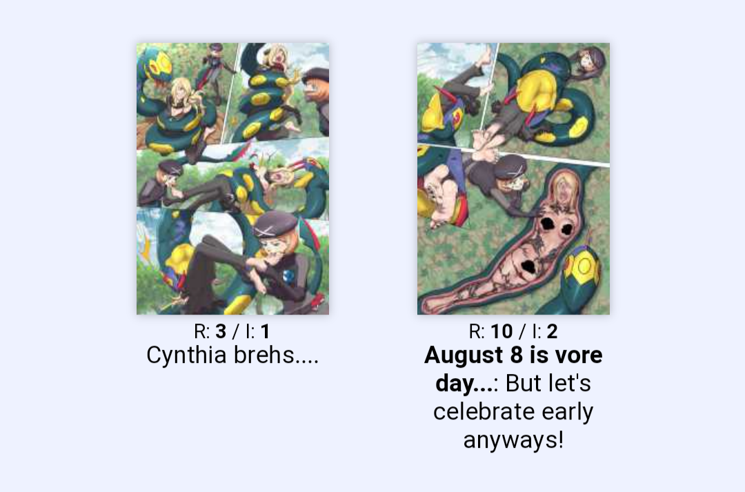 Aldith heard it, or perhaps felt the faint vibration. She chuckled, placing a hand on the bulge. “Hear that, sweetie? She’s still asking. So polite. Now, you digest well, my love. We don’t want any bones puncturing the cloaca. And do try to cough up those headpieces and the necklace later. Might fetch a nice price from a trophy collector.”The night deepened. No trainers came. No wild Pokémon interfered. The clearing remained a secret grave.*The week that followed was a slow, unbearable unraveling.Inside Seviper, Cynthia’s world shrank to a universe of pain and dissolution. The first day was the fire, the burning of her skin, the melting of her remaining clothes. The second, the acids began their work in earnest, breaking down the outer layers. Her screams became weak cries, then whimpers, then silent, tearless misery. Her thoughts dissolved from coherent despair into a primal slurry of suffering and regret. She thought of Dawn’s smile, of Garchomp’s roar, of her grandmother’s stories. They became distant, dreamlike things, washed away by the burning tide.Her body, so tall and proud, was compressed, kneaded, and liquefied. Nutrients were absorbed through the serpent’s lining, fueling its incredible power. Her proteins, her fats, her very essence, became part of the monster that had consumed her. By the fifth day, coherent form was gone. By the seventh, the process was nearly complete. The large, defined bulge in Seviper’s middle had softened, shrunk, and finally smoothed out into a contented, full swell.In the clearing, Aldith waited with fanatical patience. On the seventh morning, Seviper convulsed slightly, lifted its tail, and with a series of muscular contractions, expelled the final, indigestible remnants onto the forest floor.