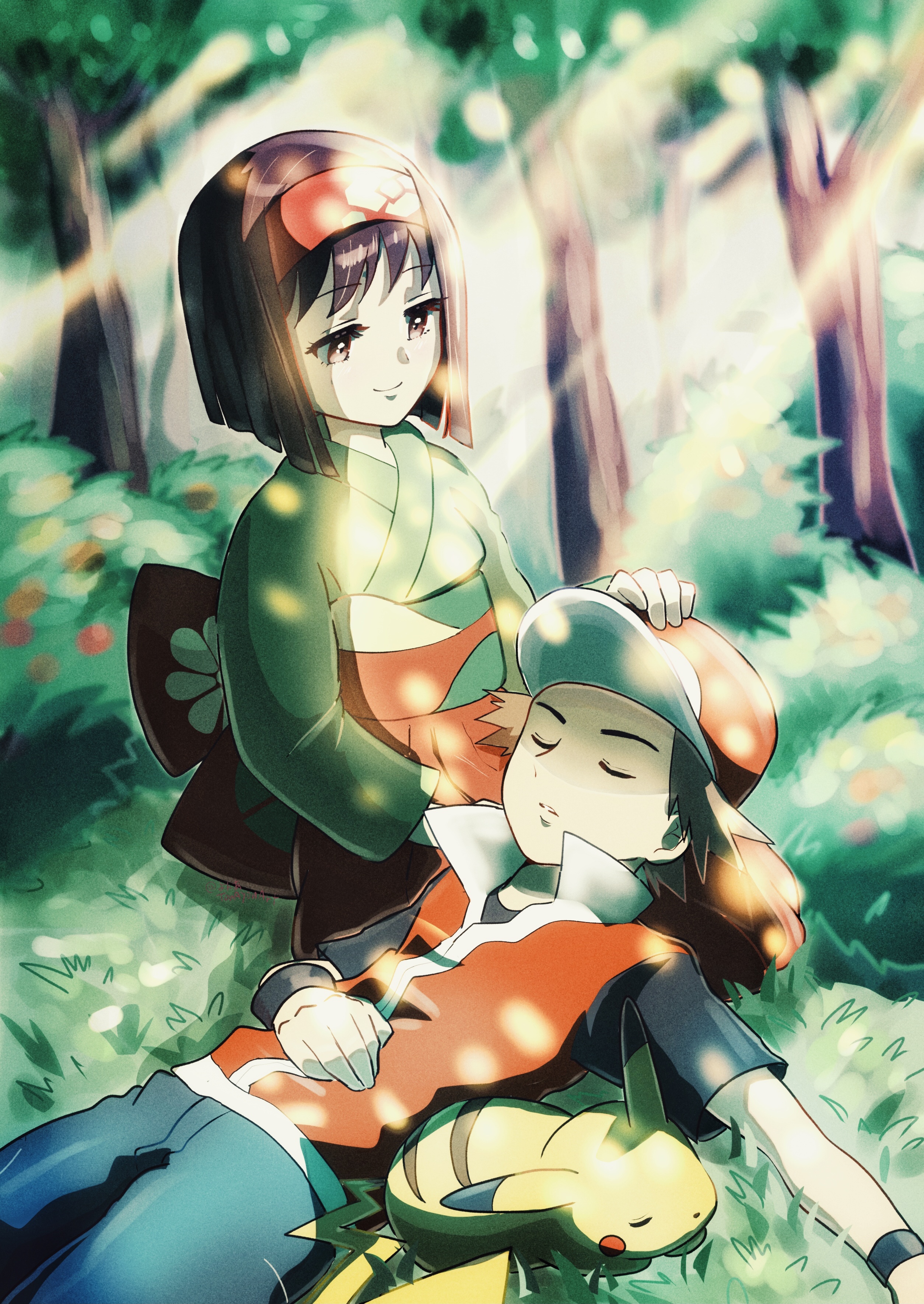 Requesting a redraw of picrel but with them wearing their sygna suits, leafeon sleeping with them, and with Erika sleeping as well but with her open mouth drooling over Red's face, in a funny and silly way