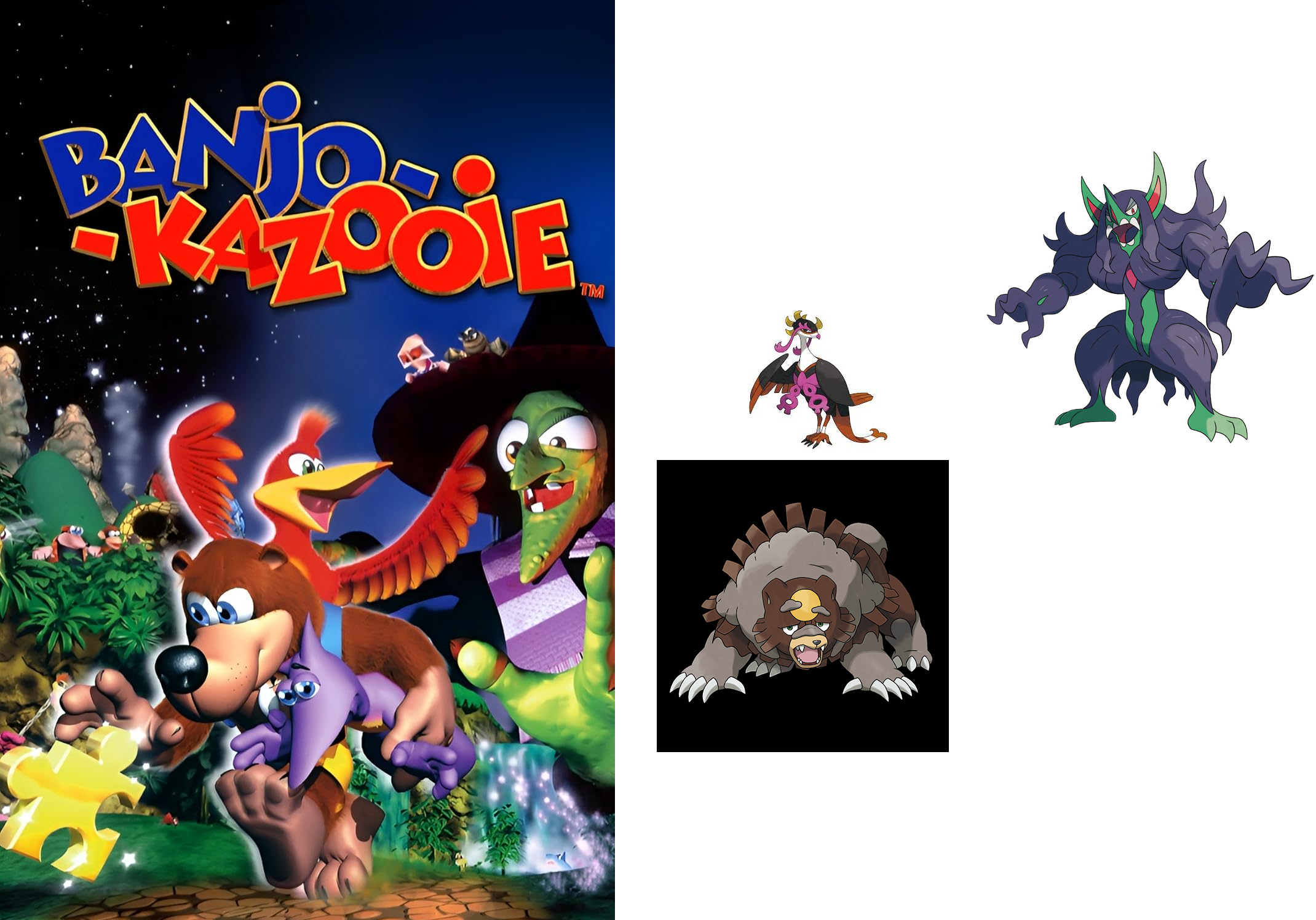 Requesting this Banjo-Kazooie art but with Banjo and Kazooie being Ursaluna and Fezandipiti respectively and Gruntilda being Grimmsnarl."Bear and Bird shall face disaster, once I activate Prankster"