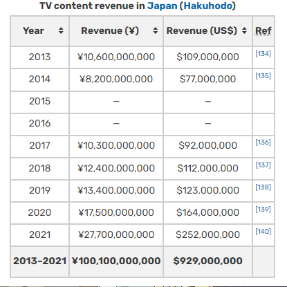 What does TV content revenue means? Because it seem Pokemon anime revenue deceased on 2014 & some reason 2015 & 2016 revenue wasn't listed.