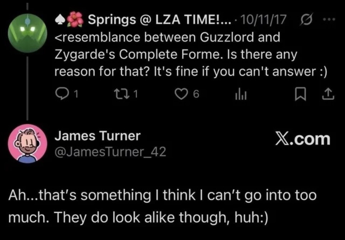 >frogposter either ignores or just flat-out doesn't know the designer of Guzzlord actually hinted at a connection between Zygarde and Guzzlord back in 2016 when it was revealed he'd designed Guzzlord