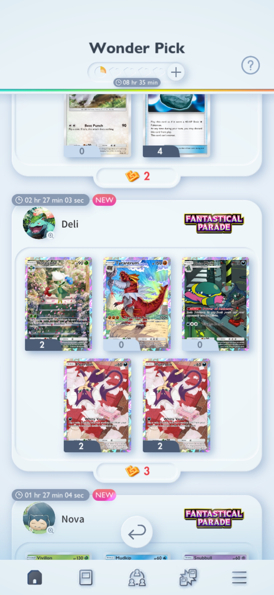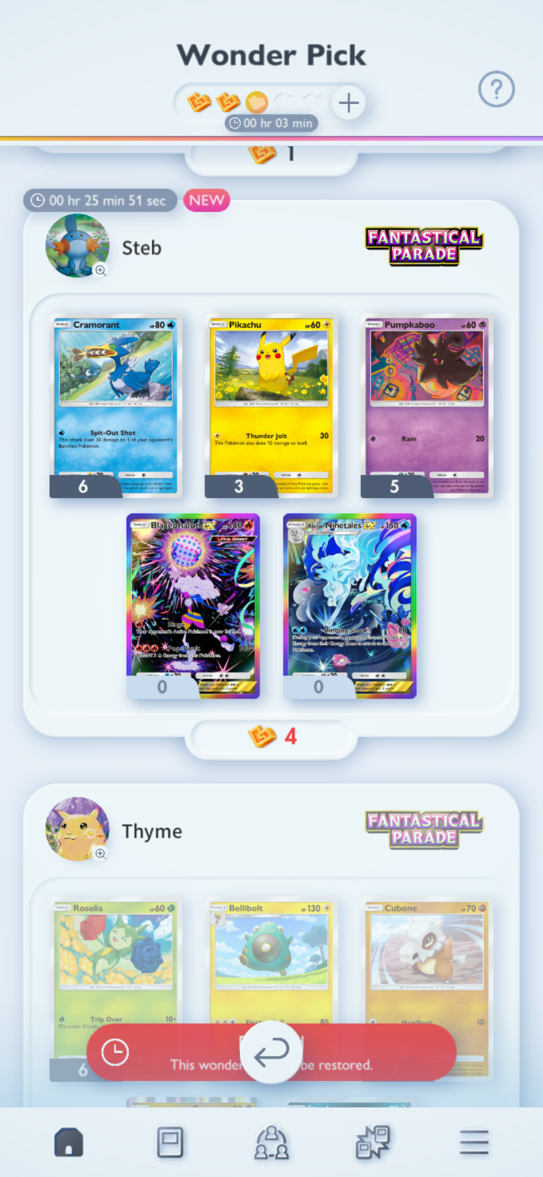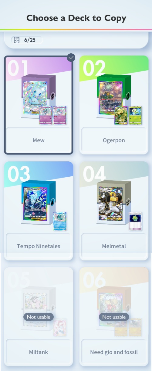 Ledyba!!>Friend ID Survey: https://forms.gle/AZyQQ2SfGeCKjXNh9>Friend ID Sheet: https://docs.google.com/spreadsheets/d/1DGhOfaMX6D_YUR-P39_OJdVmAl0uacohIRstE9oN9SQ/edit?usp=sharing>Tournament results/decklists: https://play.limitlesstcg.com/tournaments/completed?game=POCKET>Deck Builder: https://my.limitlesstcg.com/builder>Datamines, etc.: https://ptcgp.raenonx.cc/en>Luck calculator: https://porygonthree.github.io/ptcgp-luck-calculator/>Advanced card search: https://pocket.limitlesstcg.com/advanced>Fantastical Parade card list: https://www.pokemon-zone.com/sets/b2//vp/ battle passwords to battle with other Anons (consider writing a post to recruit players)>/vp/‘s own meta (no random effects, no ex): vpnx>meta decks or high level play: vpmeta>/vp/ anything: vpPrevious Thread: >>58897204