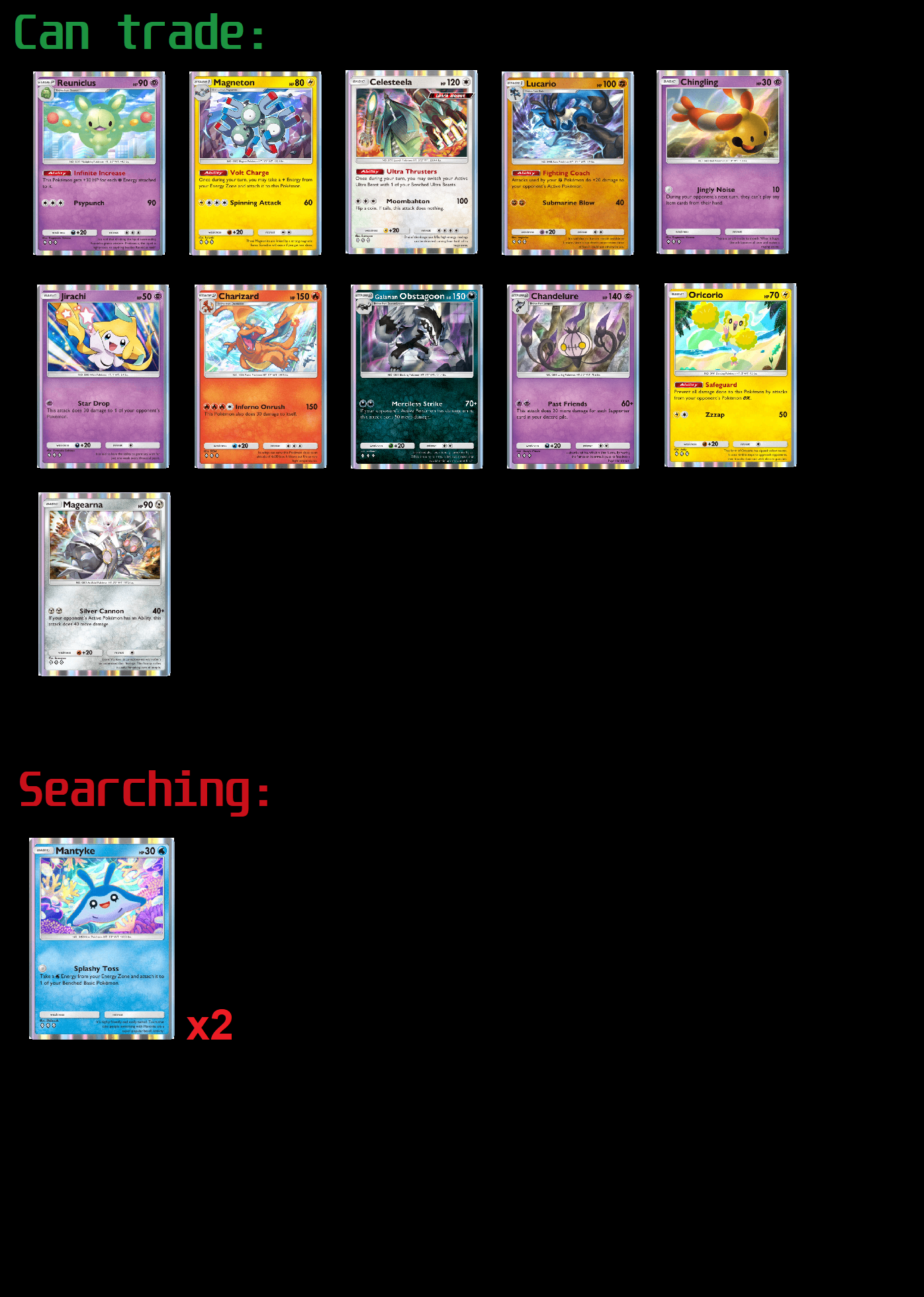 Anybody want to trade a 2star Juggler to me? I have Blaine, Koga, Brock, Leaf, Red, Silver, Cynthia, Lidia or Serena in exchange. I have a few RRs as well: Mismagius ex, Umbreon ex, Gengar ex, Mega Blastoise ex, Alolan Ninetales ex.