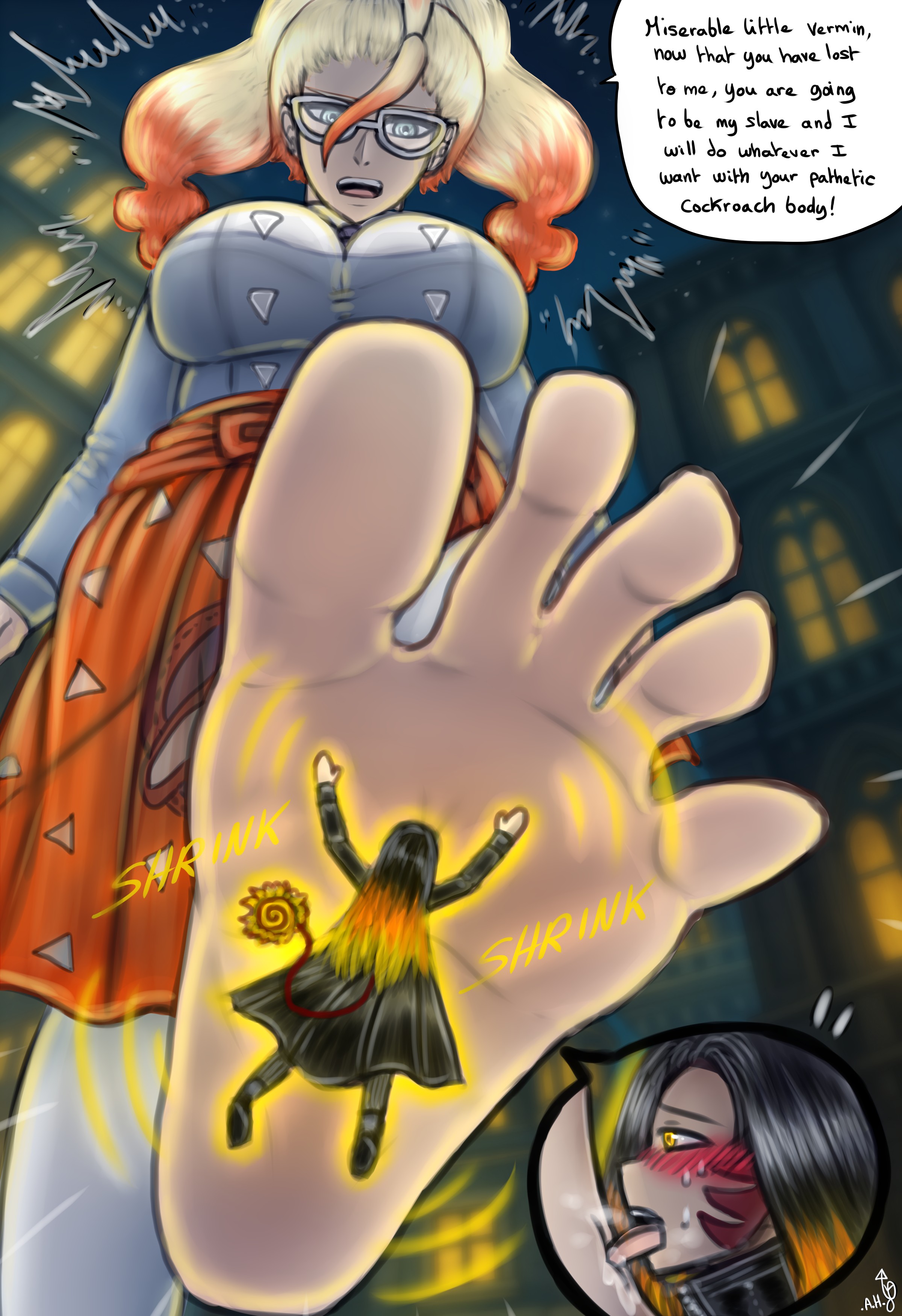 >>58908922>Krystal was the first victim shrunk by Whitney, and she was the largest survivor. Apparently, Whitney likes to make them smaller and smaller over time. Krystal was shrunk to roughly the size of doll. This makes her a giant to the other trainers, and compared to your ant size, she's positively humongous. She's using three lasses, still giant to you, on their hands and knees, as a seat while a Kimono Girl is massaging her left foot. The Kimono girl is on her tip toes and struggling to reach the ball of the larger foot. The other foot is still shoed. >When your close enough to Krystal that she notices you, she shifts her weight, causing the giant lasses to whimper underneath her. In the same motion, she puts her foot flat on the ground, on top of the large Kimono girl. She repositions the Kimono Girl to her toes and uses her as a fidget toy. You watch as the toes twice as large as you flex and pinch the giant, otherwise elegant, lady.>Finally, she says, "Wow, talk about a runt. You must have really upset Whitney to be so super tiny. Is there anything you're good for at that size?">When you don't respond, she sighs over-dramatically and lifts her bare foot behind her shoed foot. The movement causes the lasses to quiver again underneath. She pushes off the shoe from behind with her other foot. The crowd of trainers panic as goes soaring behind you, landing with a loud thud on it's side.
