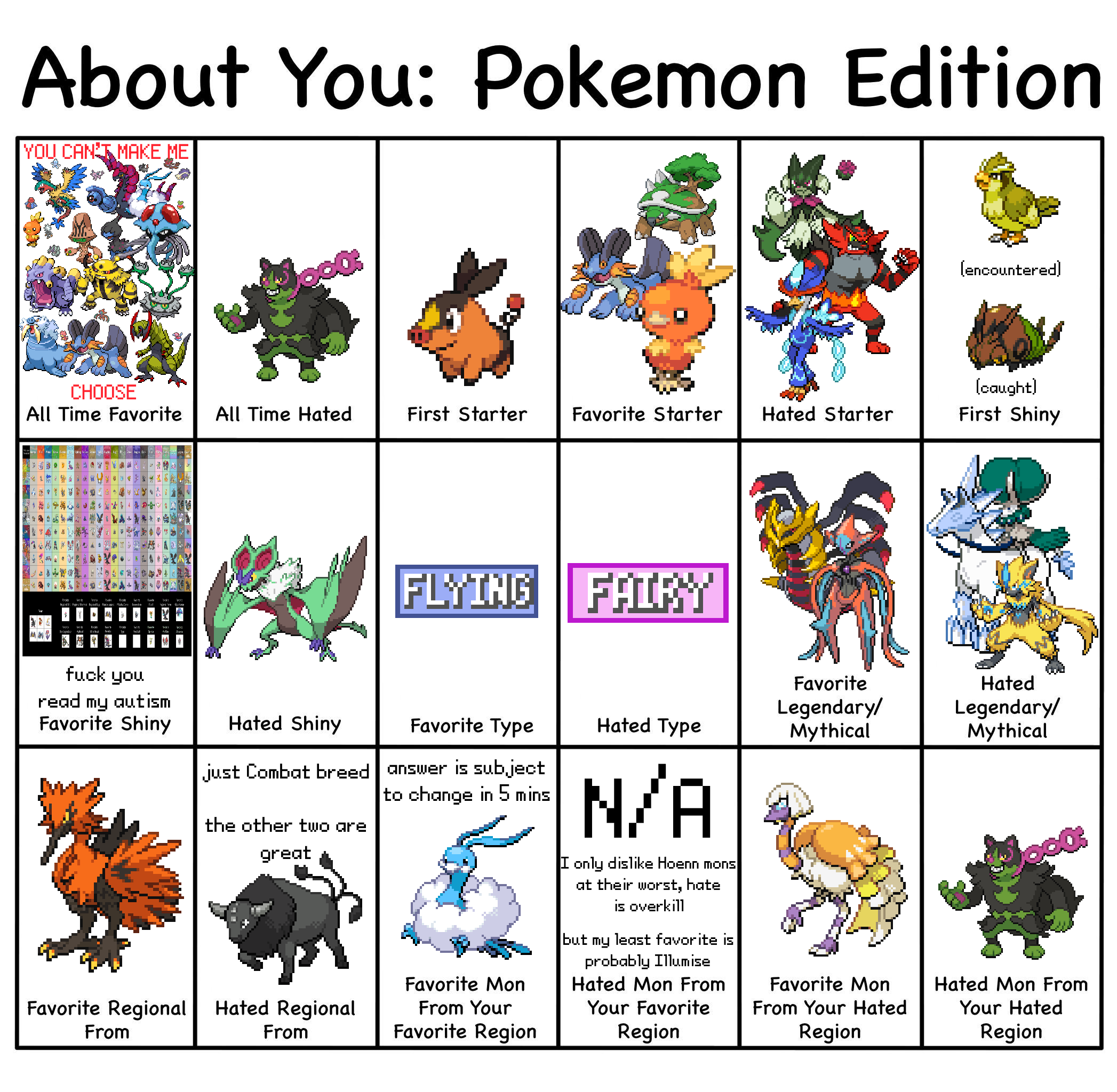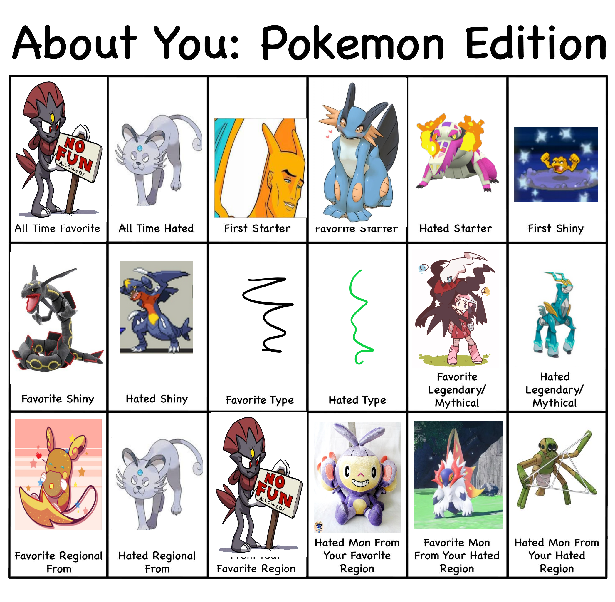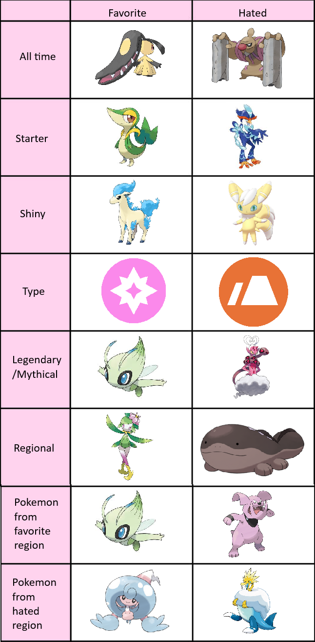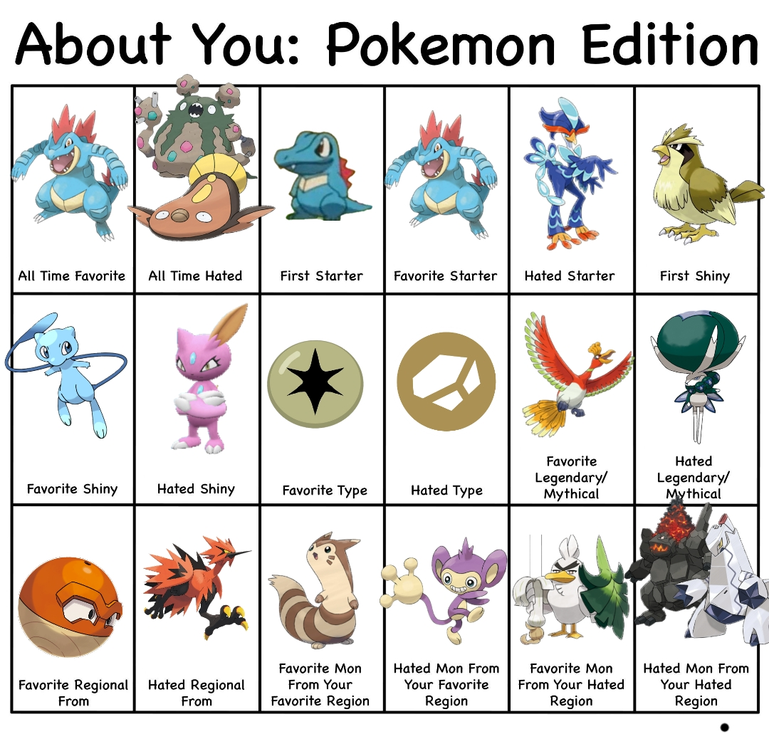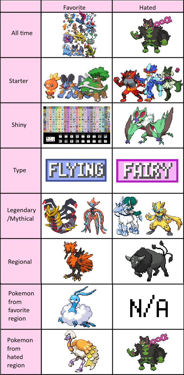 >>58909513It's actually 8/18>All time hated>Hated starter>Hated Shiny>Hated type>Hated Legendary/Mythical>Hated regional>Hated Mon from favorite region>Hated mon from hated regionI wouldn't call favorite mon from hated region as a hate. It's something you like and it'd be counting hated region twice