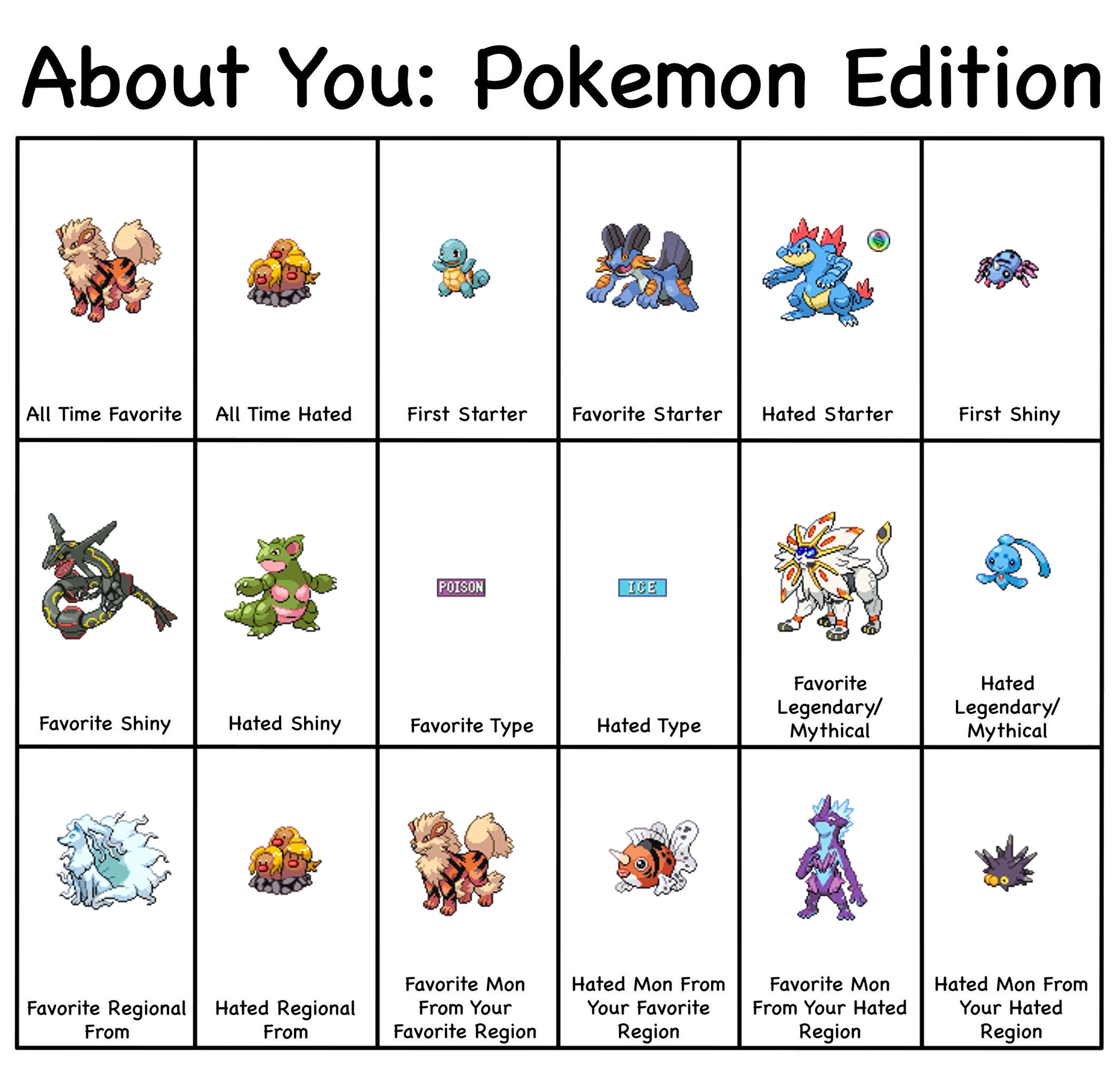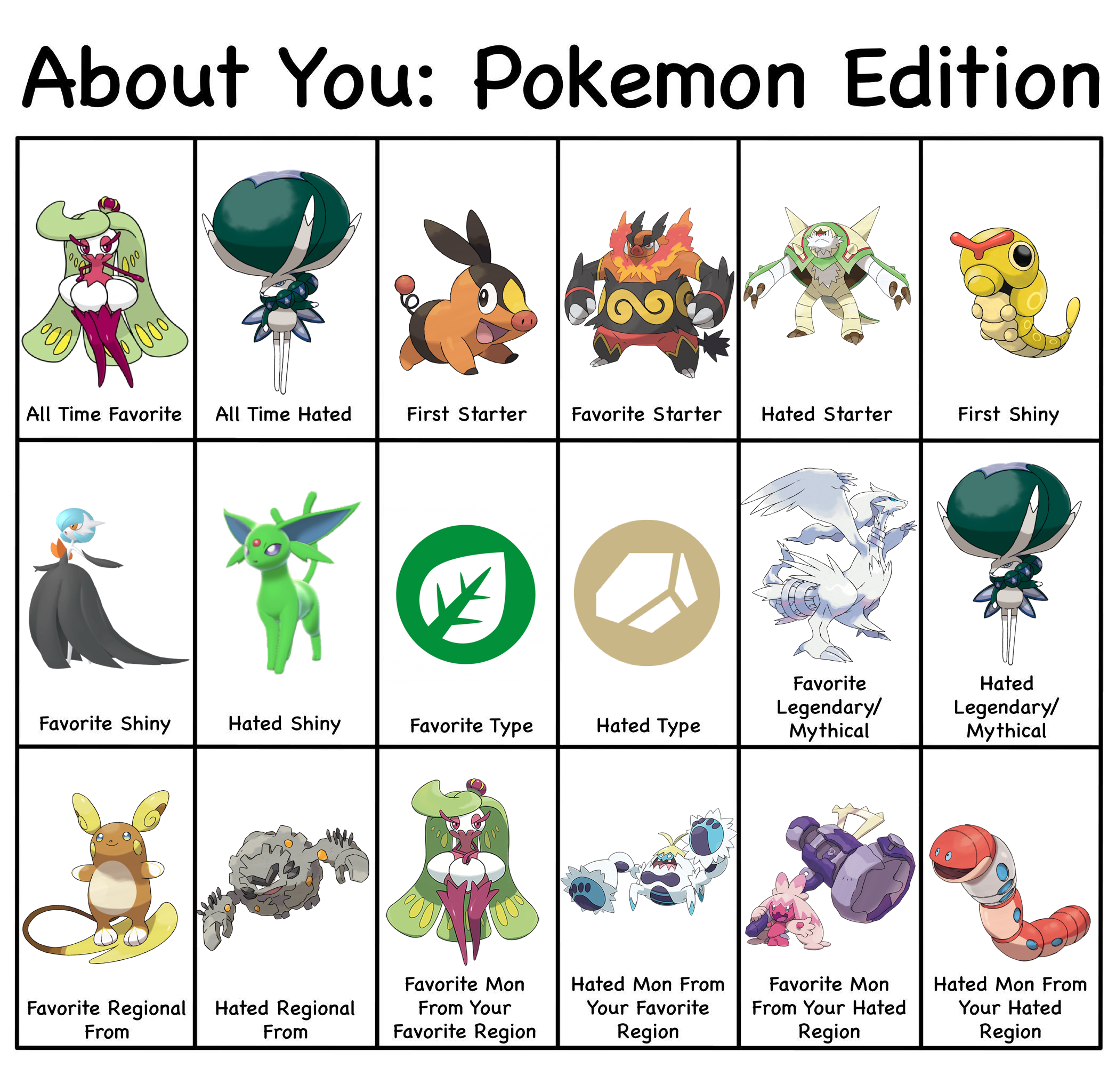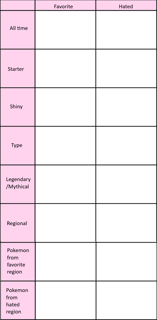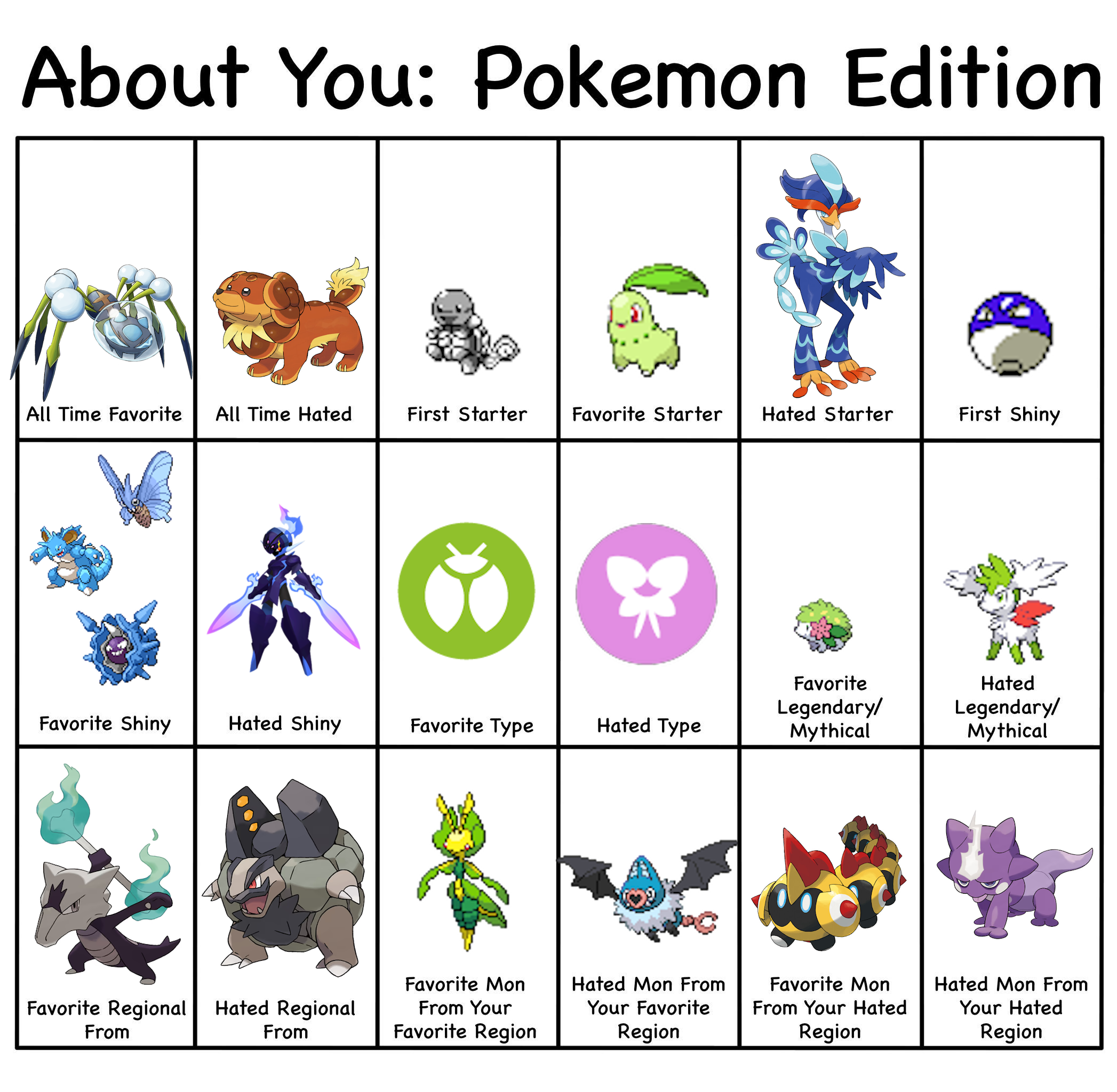 >>58909513It's actually 8/18>All time hated>Hated starter>Hated Shiny>Hated type>Hated Legendary/Mythical>Hated regional>Hated Mon from favorite region>Hated mon from hated regionI wouldn't call favorite mon from hated region as a hate. It's something you like and it'd be counting hated region twice