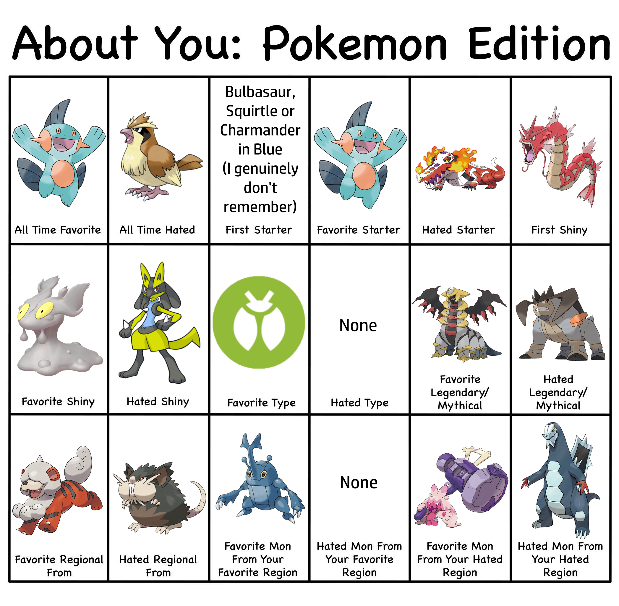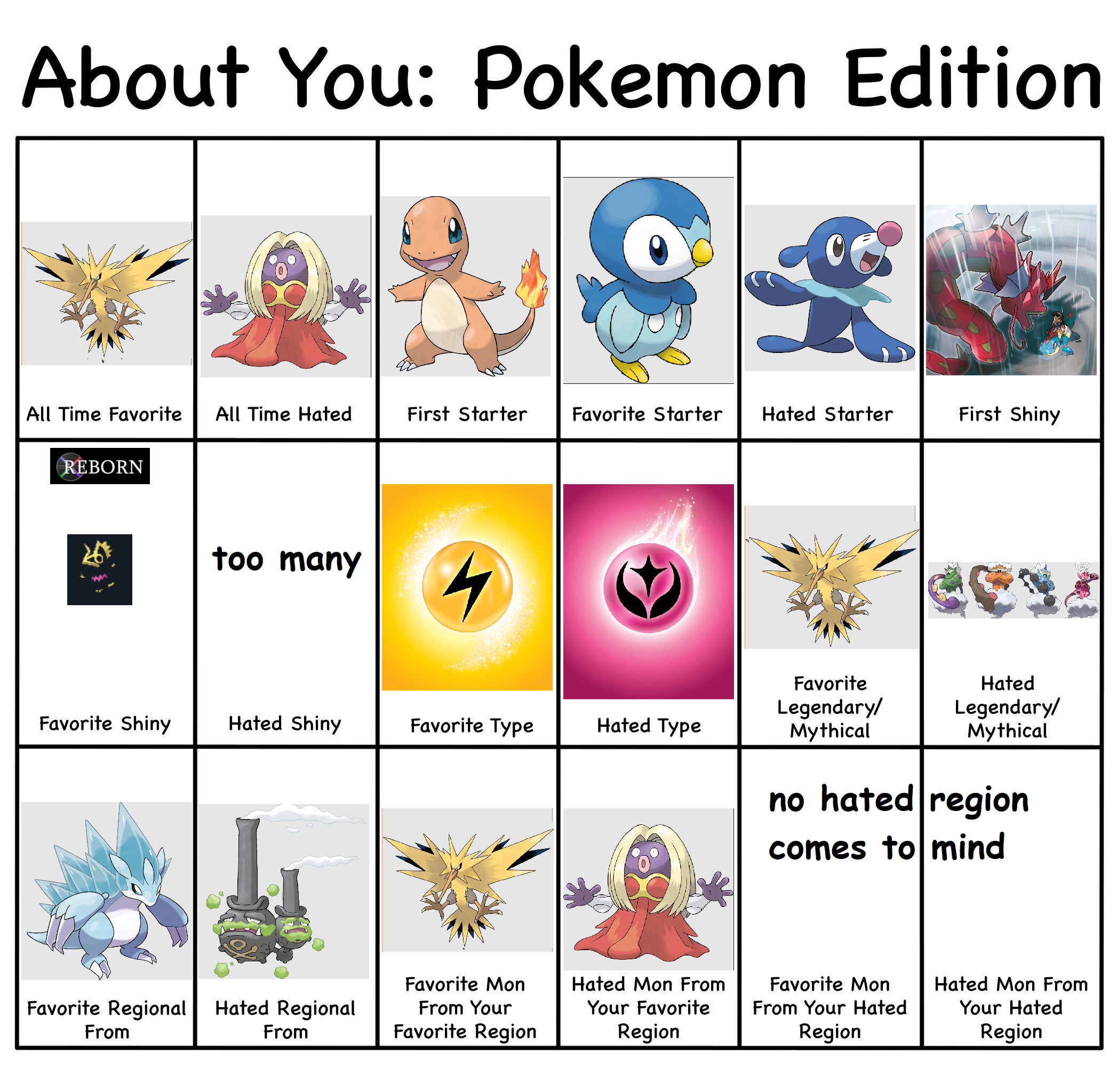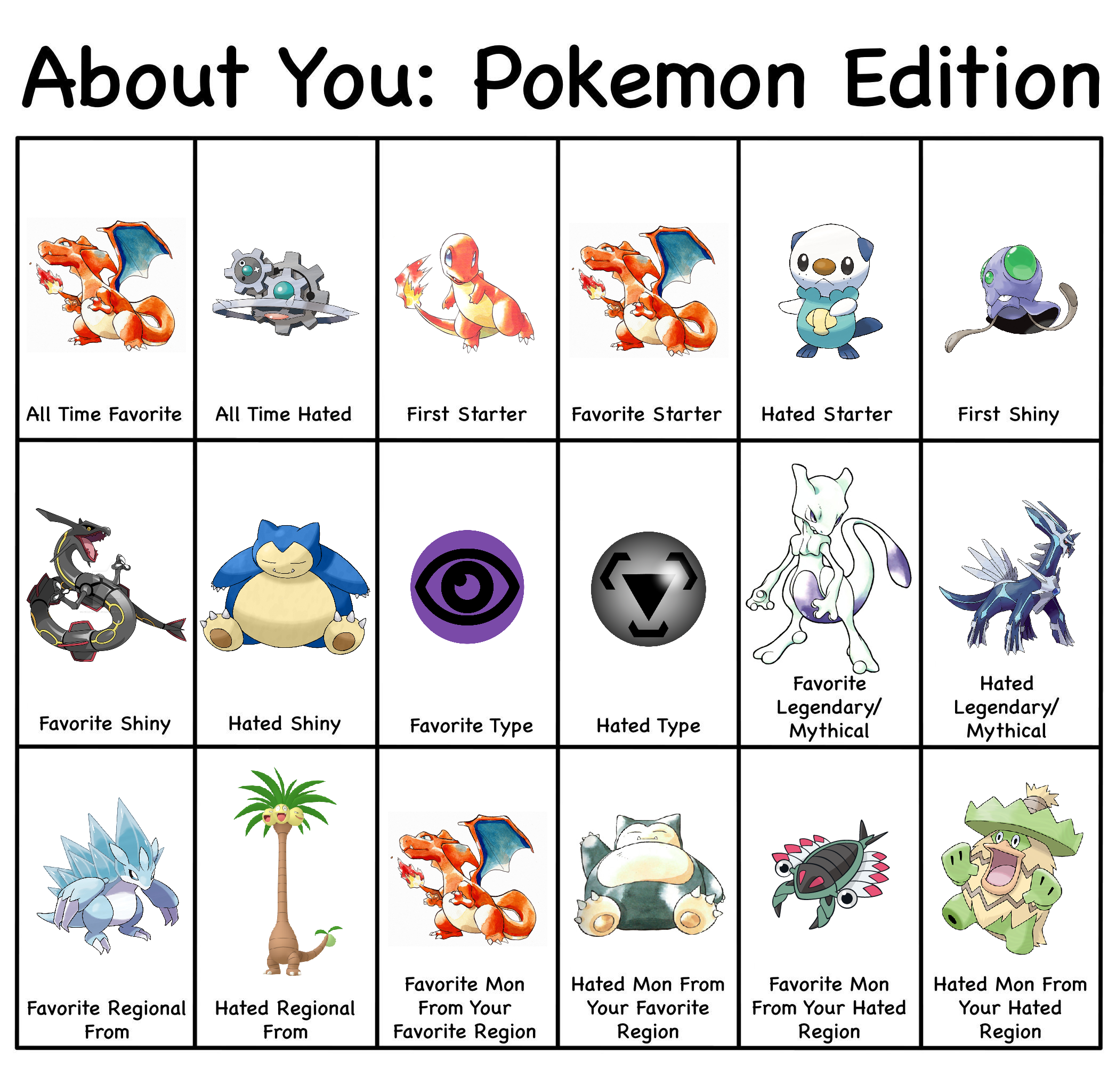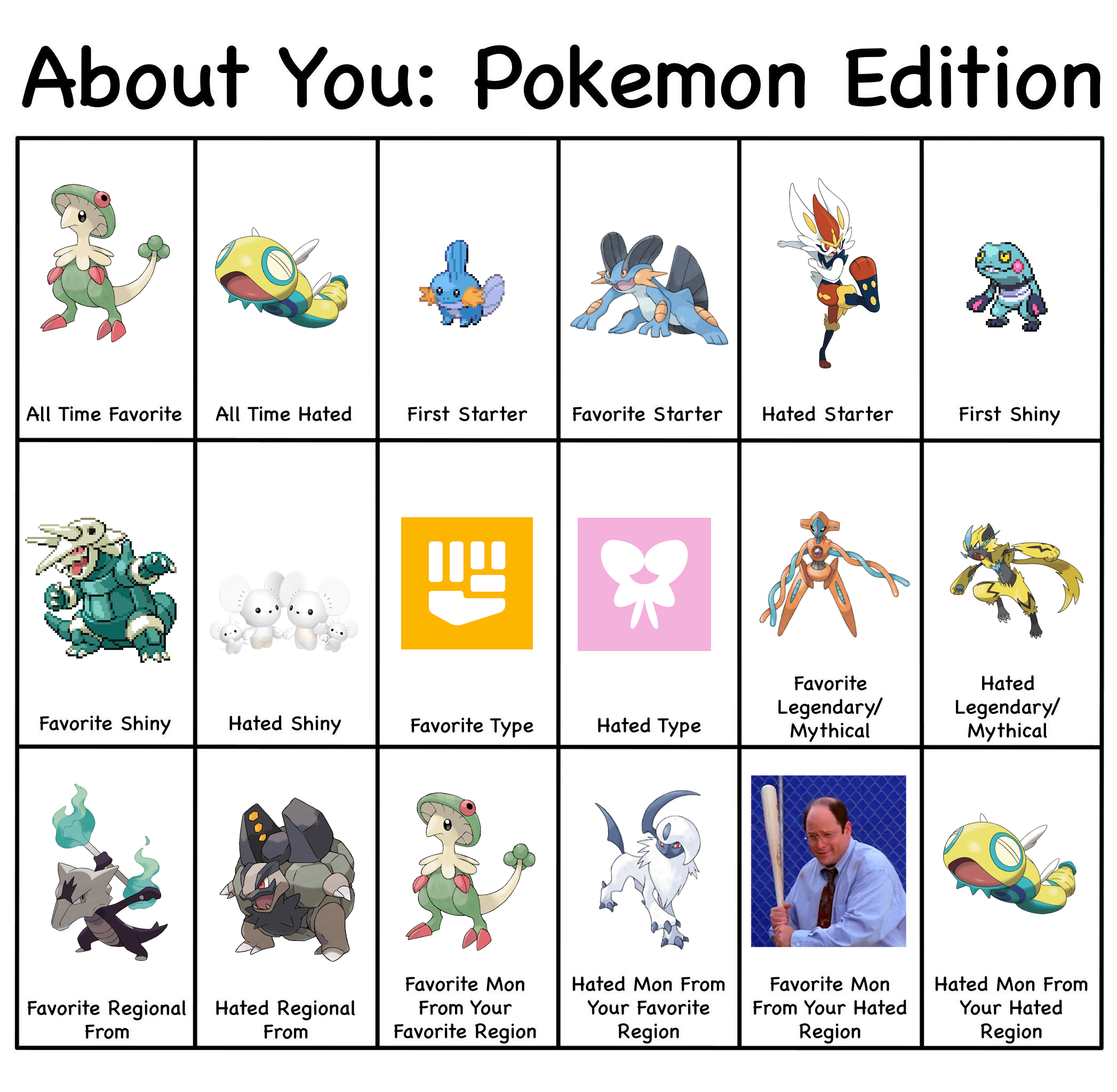 >>58909513It's actually 8/18>All time hated>Hated starter>Hated Shiny>Hated type>Hated Legendary/Mythical>Hated regional>Hated Mon from favorite region>Hated mon from hated regionI wouldn't call favorite mon from hated region as a hate. It's something you like and it'd be counting hated region twice