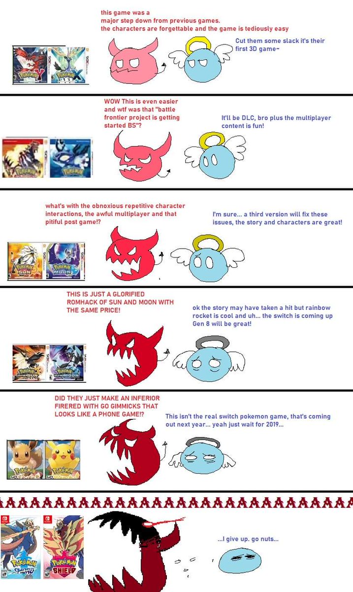 Counter-point: They had autistically and derangedly attached themselves and their psyches to a kid's IP to the point when it continued to do it's "Kid's IP" shtick by re-selling older games to current gen, as they had with FRLG and HGSS before them, they were unable to accept their place in the fanbase as an adult fan. And thus got what they deserved.