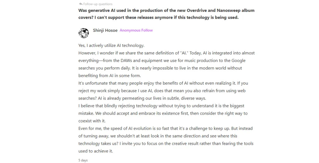 >>58928155You can look it up, there were quite a few pieces of coverage on it and it was even talked here on /vp/ a month back or so. Hosoe blatantly admitted to using AI, the images on my post are easily verifiable with a bit of research. And to answer your question, probably not, it would be a PR nightmare if they admitted one of their composers is an AI jeet(gook).