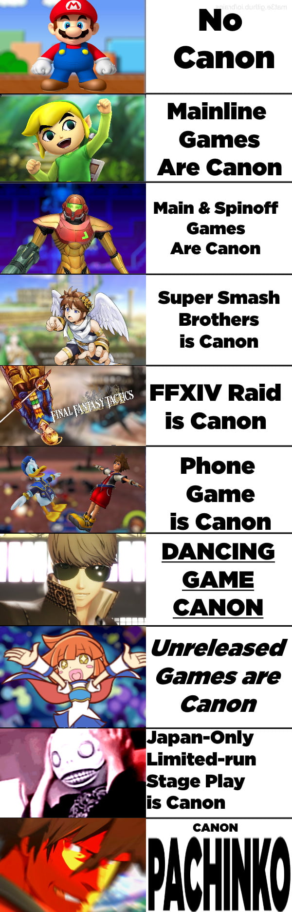 >>58939811you're jumping through a lot of hoops now. It's as absurd as nintendo claiming that everything from smb3 to mario galaxy to mario maker to even super mario run are mainline titles, when clearly the autorunner and level editor are spinoffs and the 2d and 3d titles are different series. It's like claiming that all legend of zelda games, including link's crossbow training and Freshly-Picked Tingle's Rosy Rupeeland are mainline.It's absurd, and you're stupid.