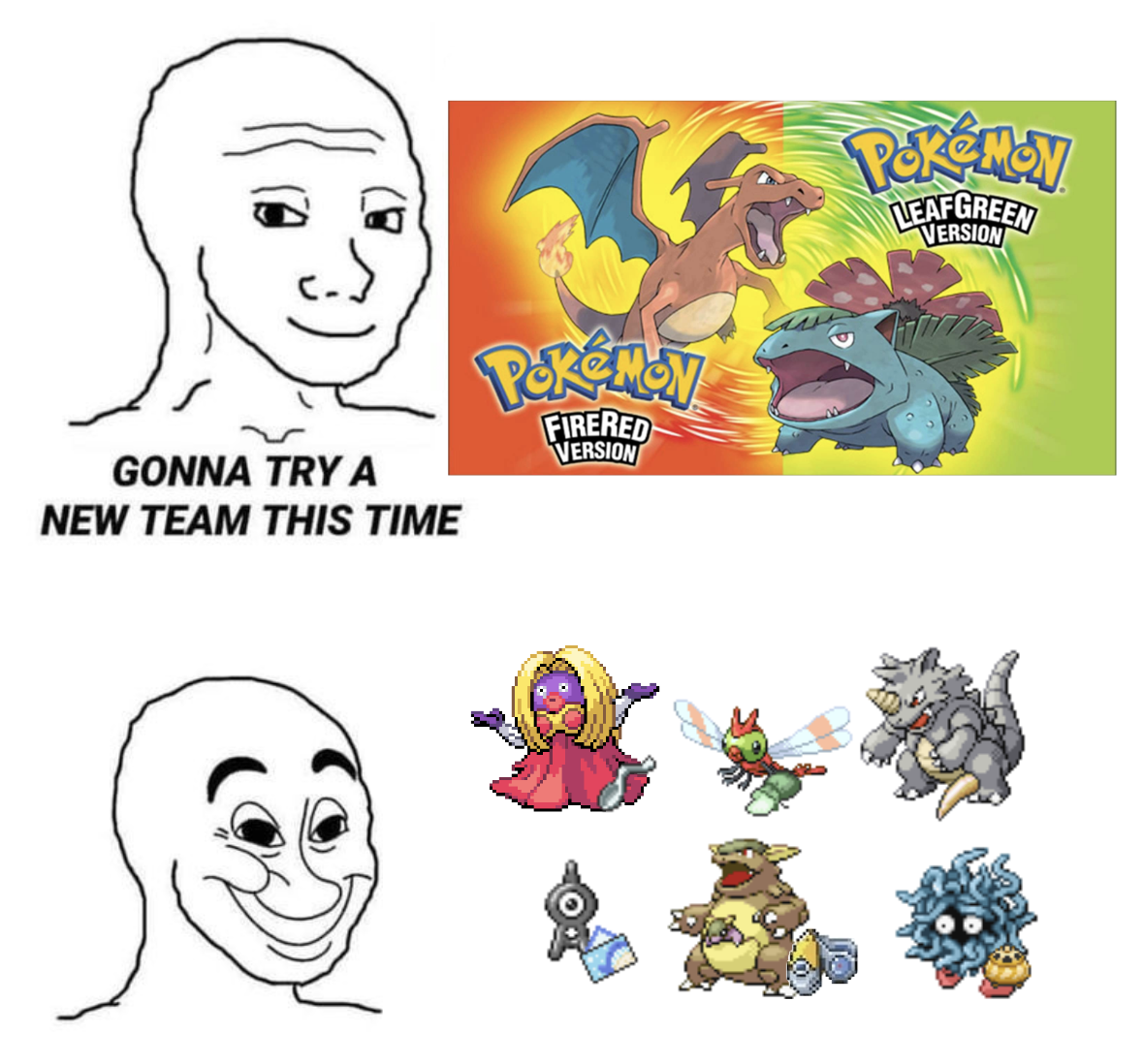 >>58946408>>58946487Yeah, trying to make this meme for other games doesn't really work and it's missing the point.There's never going to be THE team when things like starters are mostly interchangeable.What makes the Sinnoh team is that DP variety was so bad, you were practically funneled into picking Chimchar.