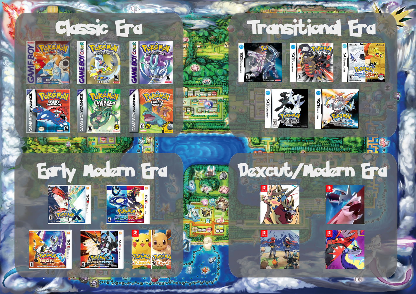 >Classic eraRed and Green (Japan)Red and Blue (international, first multiplayer boom)Blue (Japan)YellowStadiumGold and SilverStadium 2Crystal>"Too cool for Pokemon" EraRuby and SapphireColosseum>Golden EraFire Red and Leaf GreenEmeraldXD Gale of DarknessDiamond and Pearl (online play starts here, second multiplayer boom)Battle RevolutionPlatinumHeart Gold and Soul SilverBlack and WhiteBlack and White 2>3D EraX and Y (huge resurgence among normies, third multiplayer boom)Pokemon BankOmega Ruby and Alpha SapphireSun and MoonUltra Sun and Ultra MoonLet's Go Pikachu and Let's Go EeveeSword and ShieldPokemon HOMEIsland of ArmorCrown TundraBrilliant Diamond and Shining PearlLegends: Arceus>Open World EraScarlet and VioletTeal MaskIndigo DiskLegends: ZAChampionsUnreleased generation 10 gamesPokemon HOME's replacement