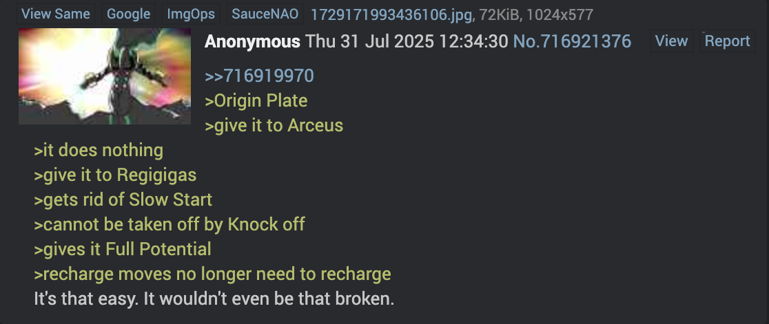 >>58958714I like to think the Origin Plate would be made of the shell that birthed Regigigas, so it's not toooooooo weird.