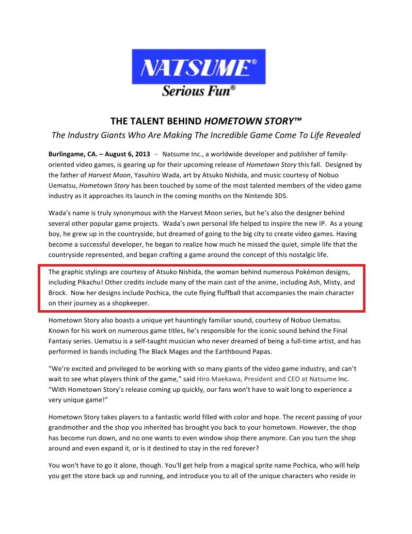 >>58966263Press release for a 3DS game called Hometown Story which she worked on