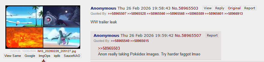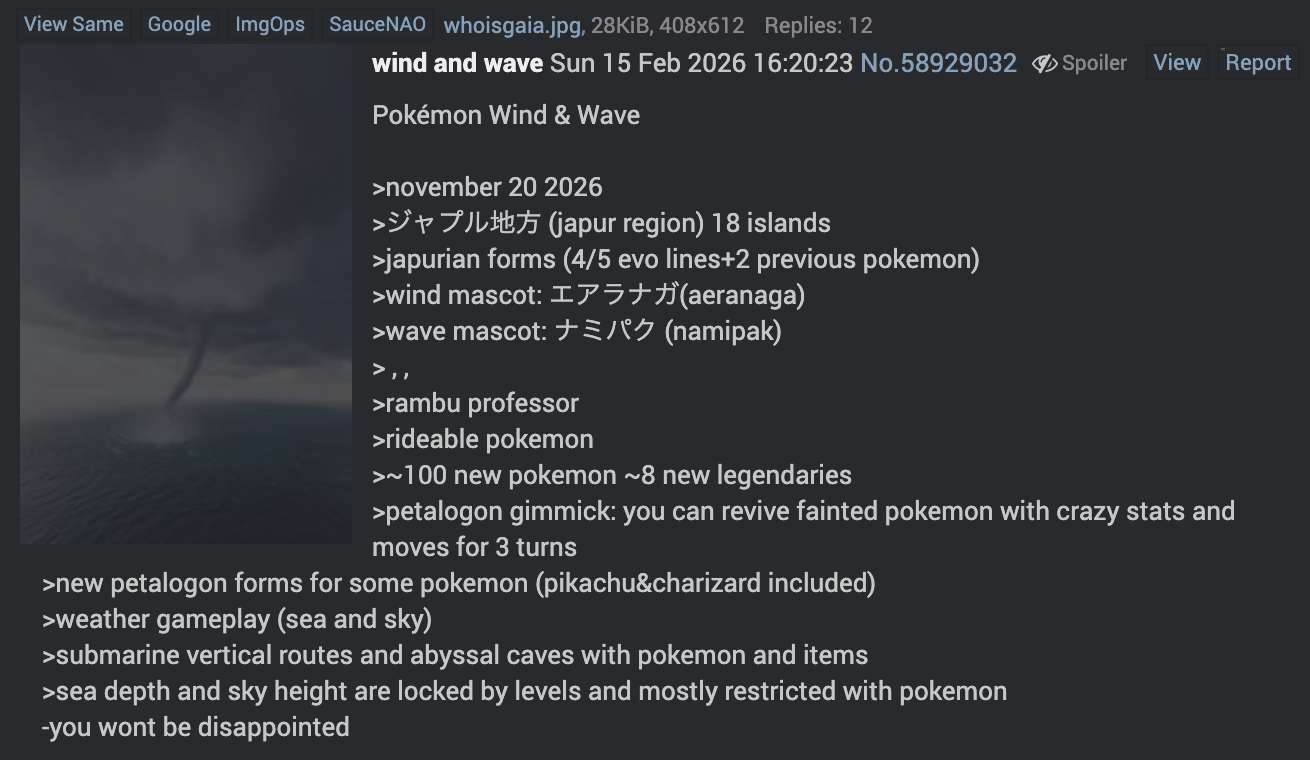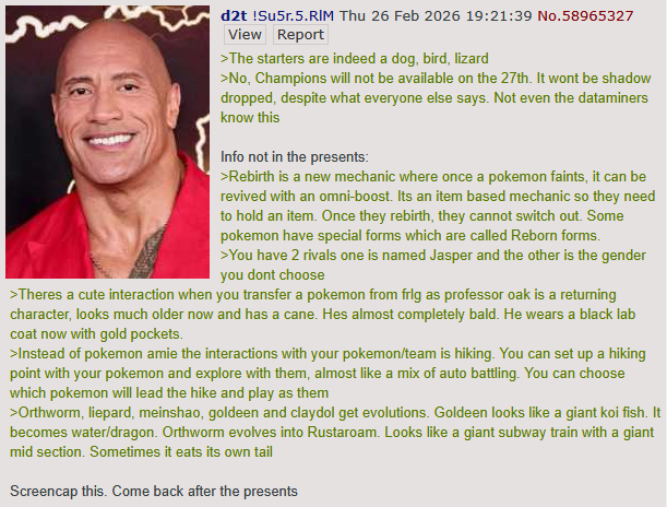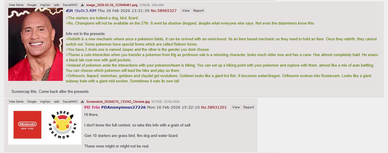 >>58972016Okay, let's take a step back for a minute.The starters have been talked about for a good while now. He obviously states as much with his "indeed" comment.And claiming that Champions would not shadow-drop was pretty safe. I never thought it would shadow-drop.Notice how he did not provide any other tidbits for the trailer. Did not even claim a 2027 release date, which not many expected.He mentions transferring Pokemon from FRLG, which was already announced. Home integration was expected already.There is nothing here that directly confirms the remaining information as true. At least not yet.Wait until June/July/August when we will likely get some more news on WW. If we get at least one other point confirmed, this can be considered true.