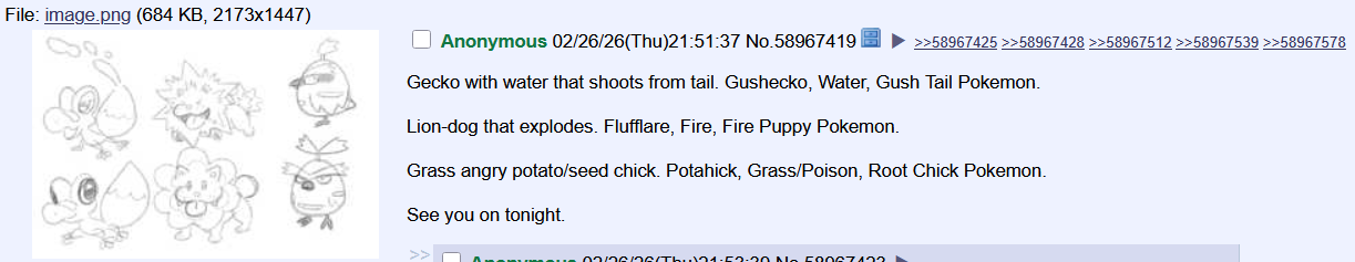 >>58972016This guy last night was partially right, too >>58967419clearly saw an image of the starters that he couldn't just copy and save, decided to sketch it himself, then just guessed at the names and details