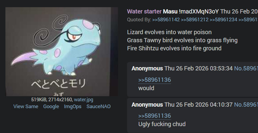 >>58982612The pic kinda looks like what AI would shit out if you described gecqua.I choose to believe this is real. Grass/flying is lame though.