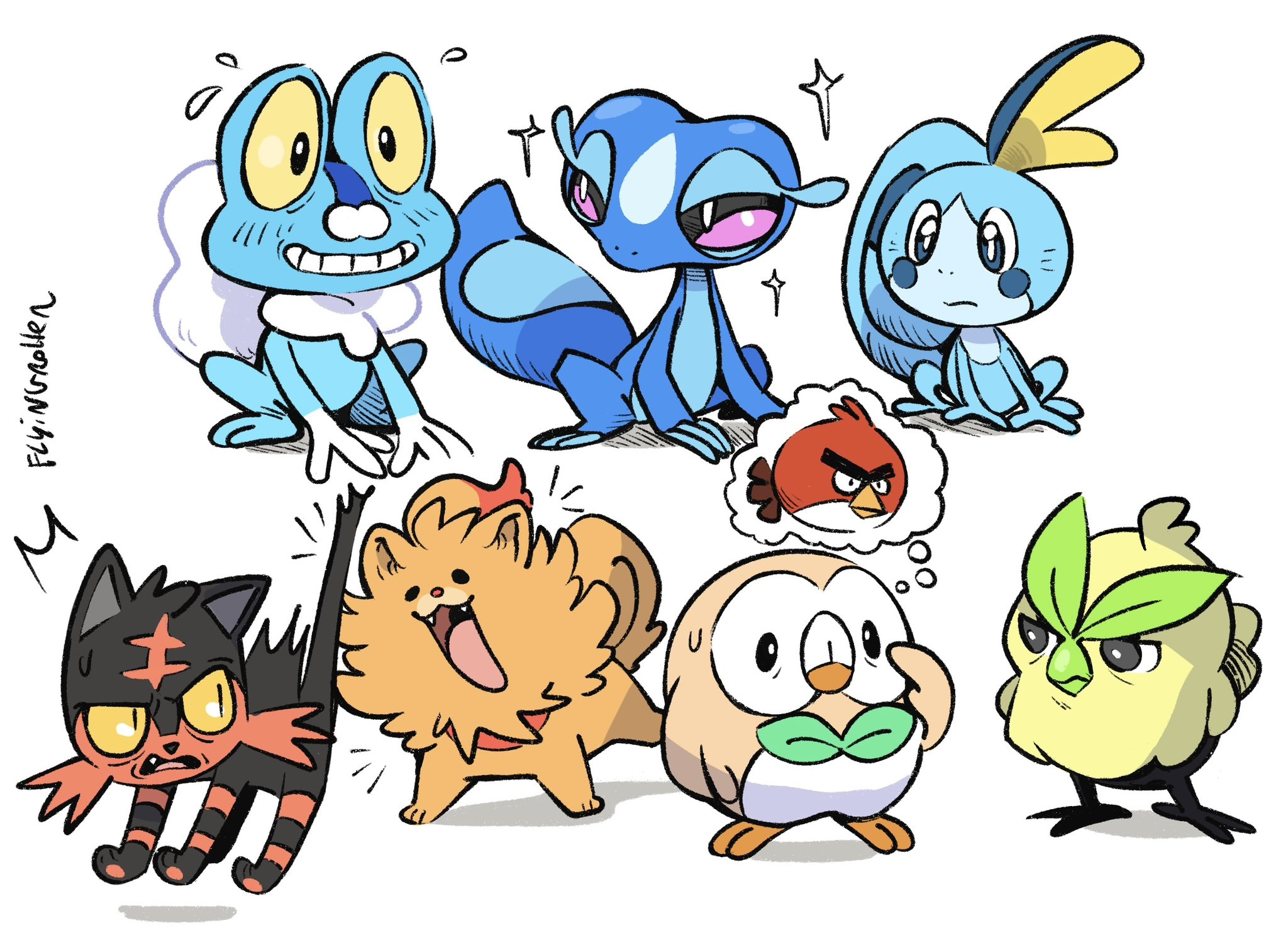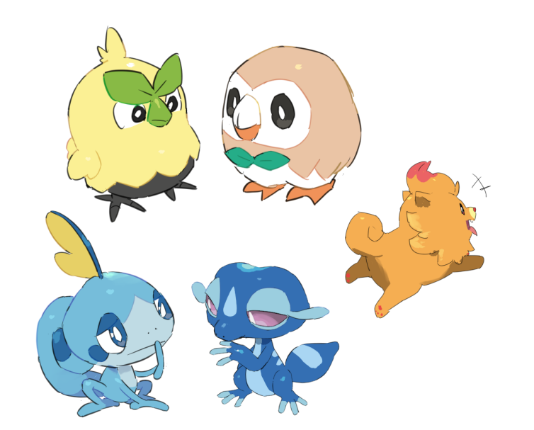 after my initial displeasure at the skunk not being real, these are... fine. They're not outright terrible like gen 8 and 9's starters. All three have potential.>browtProbably a meme pick, has the most variety for the final form options. I bet he'll be the "bara" option. I just can't figure out what type of bird it's supposes to be to find out where the design will land in the end. I would have guessed lithe fellow if not for roothoot. Or uh, decidueye.>pombonprobably going to be, perhaps obviously, the female-appeal choice. I expect some sort of lithe werewolf-esque design that goes from this goofball to a ladykiller. I would have guessed bara if not for incineroar.>gecquaObvious waifumon. Let's be honest. One of the reasons the above are swapped archetypes in my mind.>bonusGrass/???Fire/???Water/PoisonIdk what the first two's secondary types will be. Maybe a fire/fighting again lmao