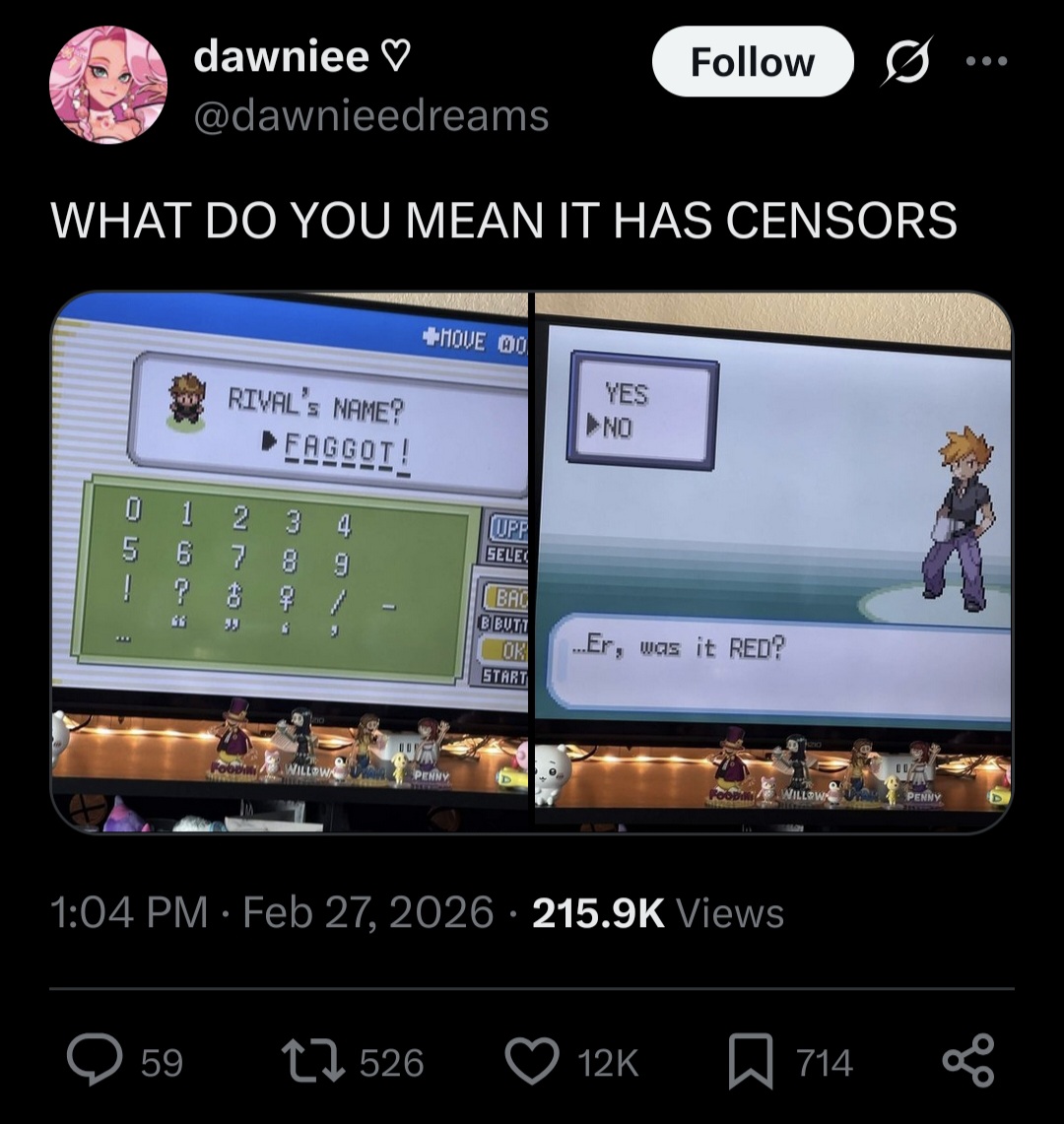 >>58975395>have all the freedom in the world to improve the games like making all pokemon obtainable, online battling and trading, etc.>only make changes that make them objectively worse like shitty profanity filterswhy is nintendo (they're the ones mandating these gay changes in games) such a shit company