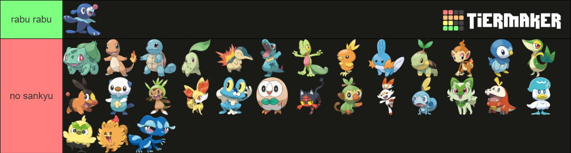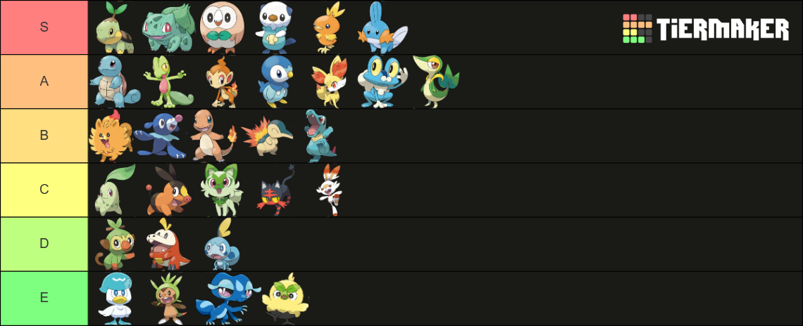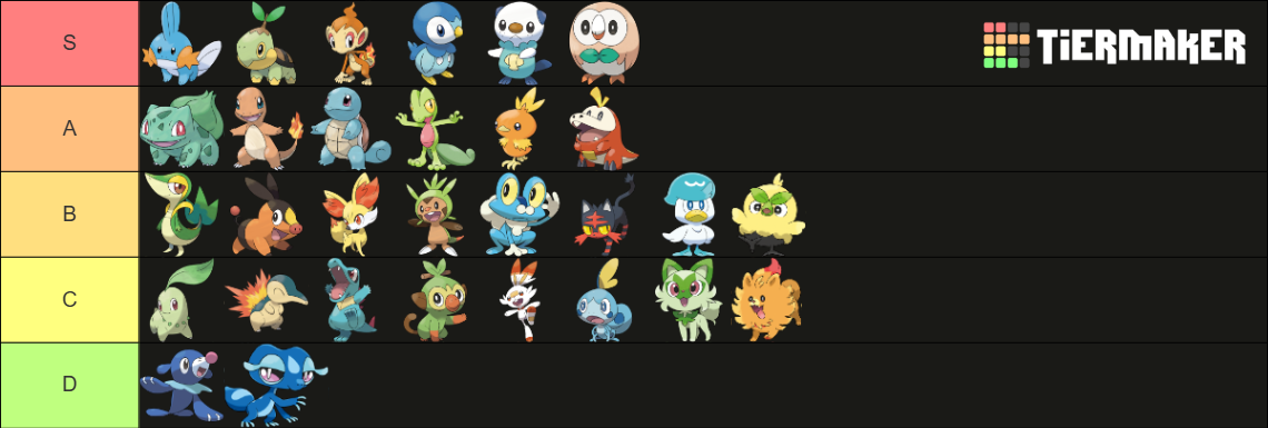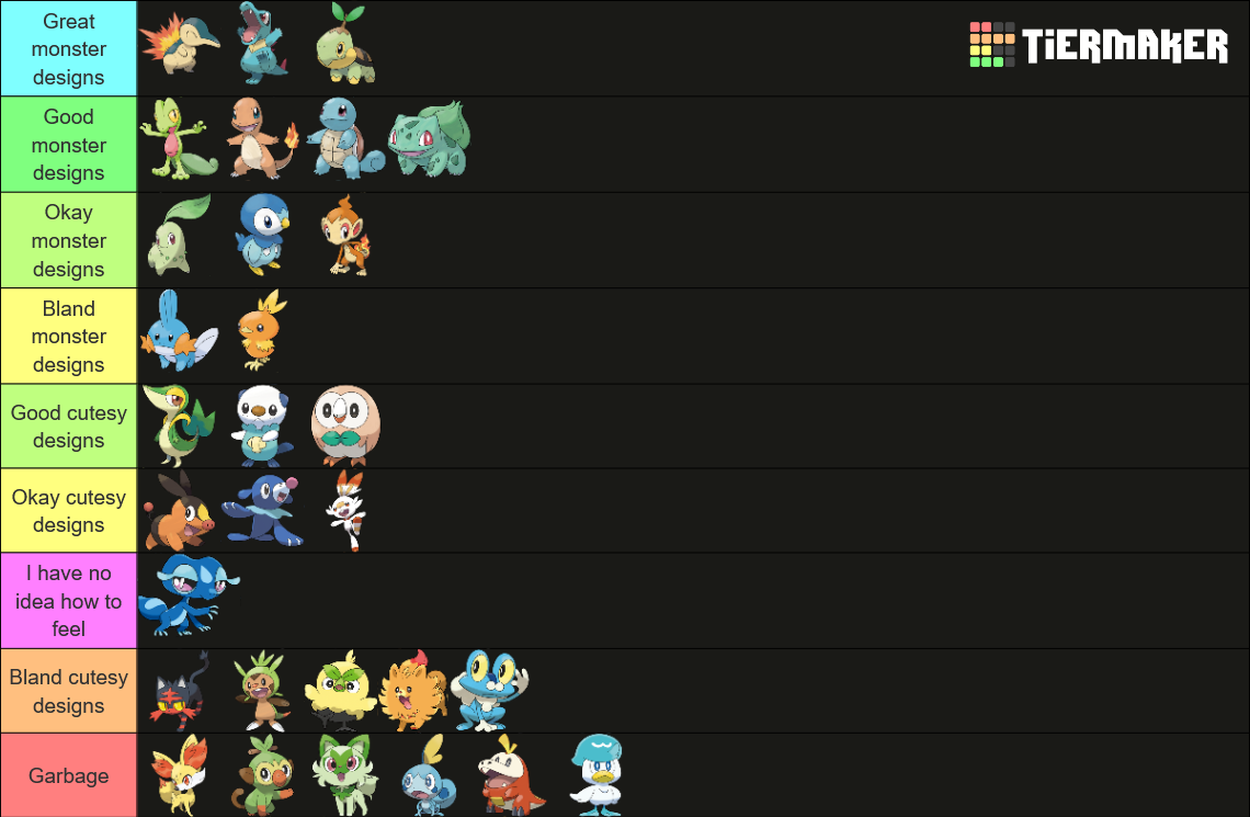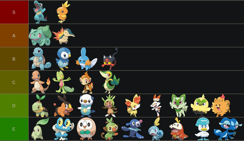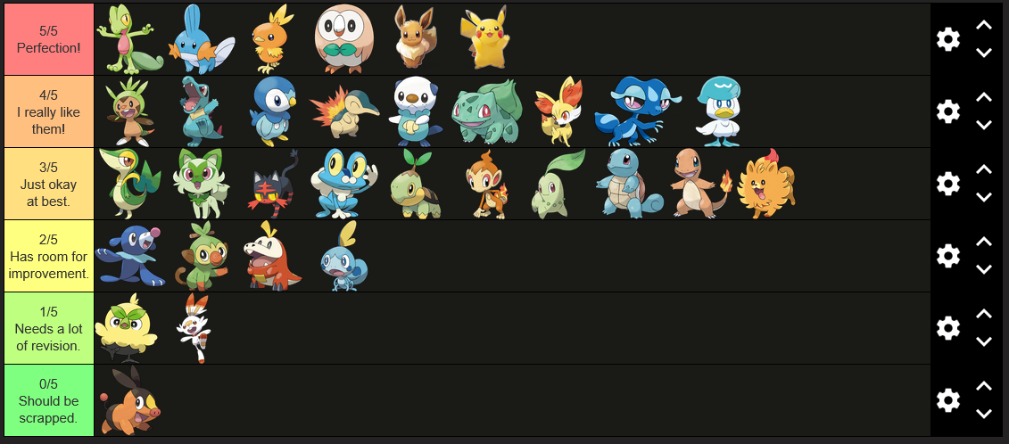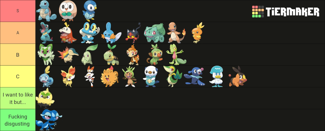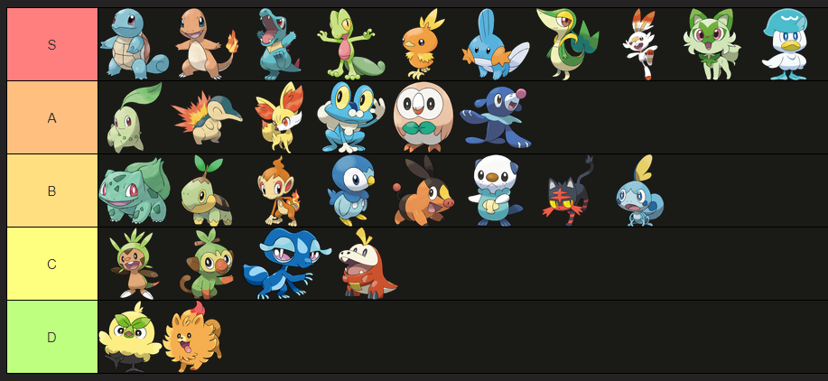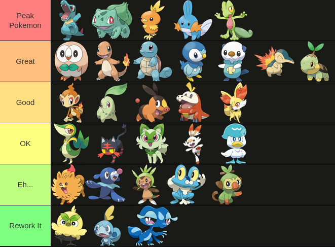 >>58976439Note that I only ever pick Grass starters. Tried setting aside my biases and rated purely based on design.