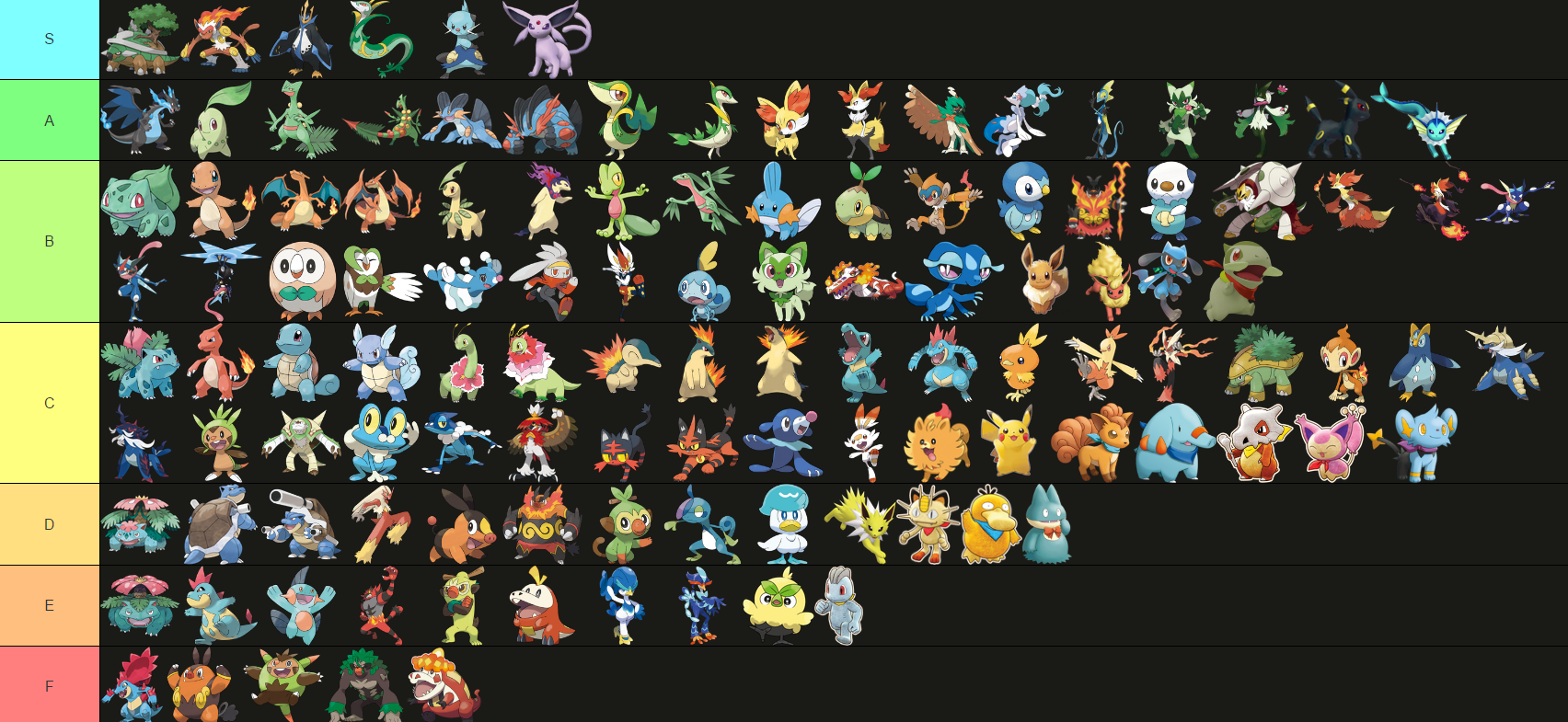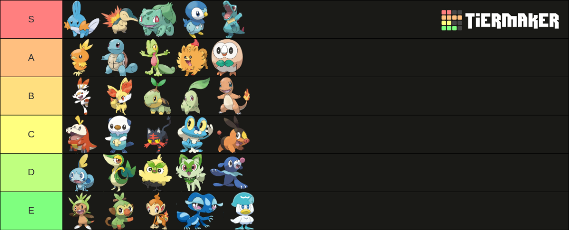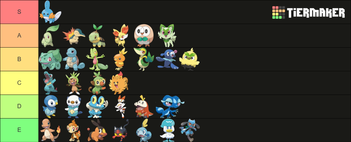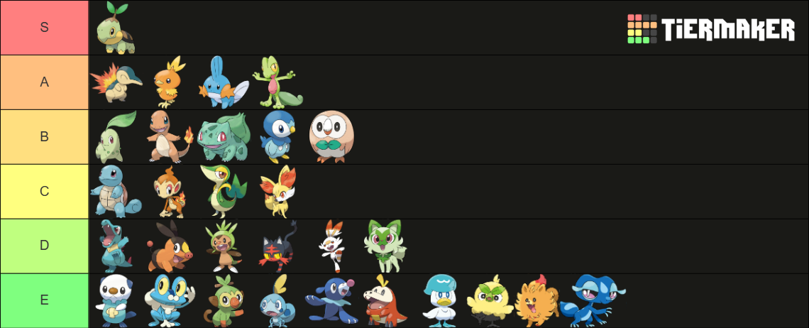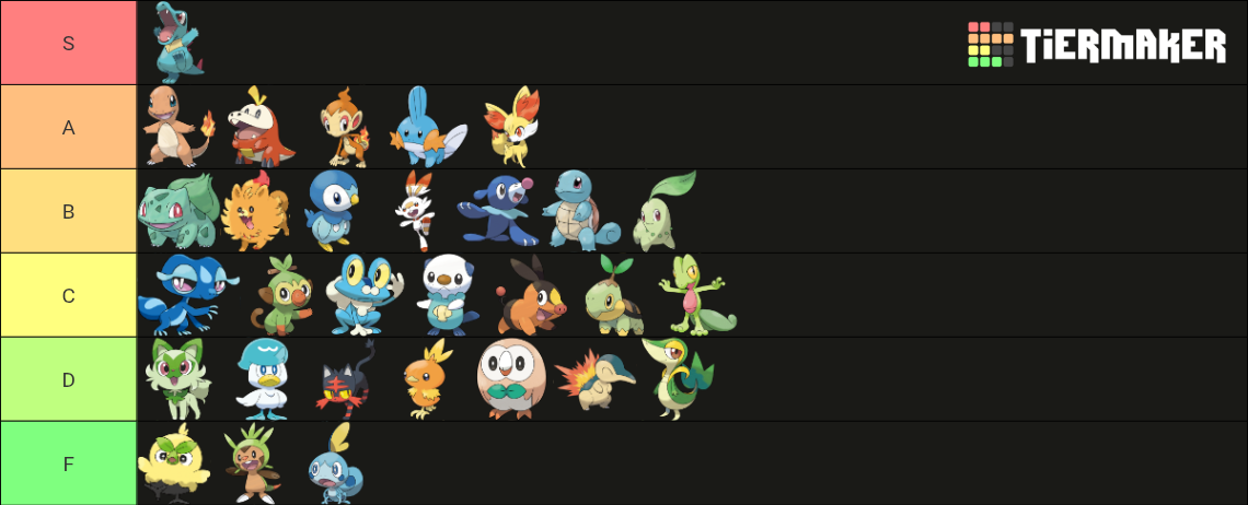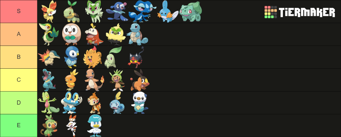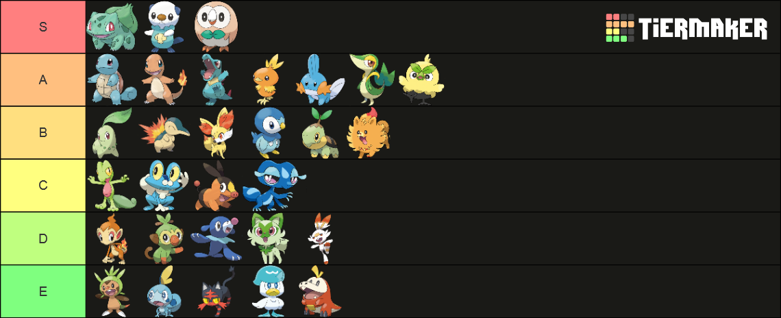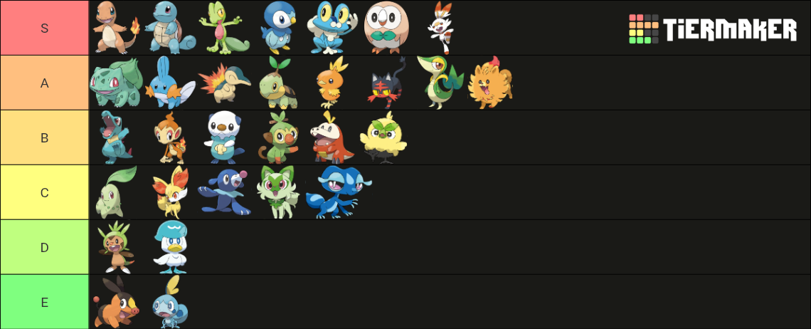 >>58976439Note that I only ever pick Grass starters. Tried setting aside my biases and rated purely based on design.