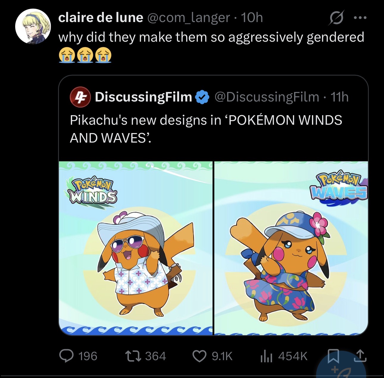 >>58981993>The male Pikachu looks like a male>The female Pikachu looks like a femaleLove to see it. I thought that part of the presentation was kinda weird because the Pikachu's didn't have to be there or anything, but now that I see it's making Western fans seeethe I love it. Pokemon is so back.