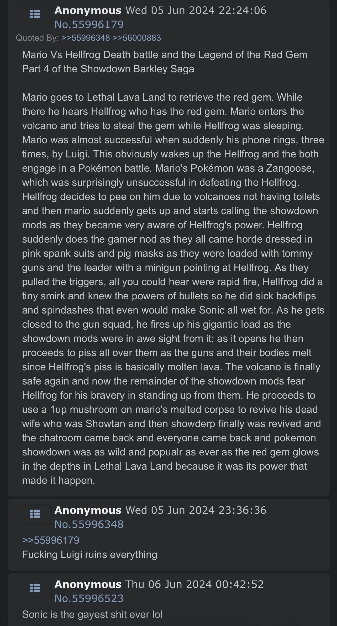 Mario Vs Hellfrog Death battle and the Legend of the Red Gem Part 4 of the Showdown Barkley SagaMario goes to Lethal Lava Land to retrieve the red gem. While there he hears Hellfrog who has the red gem. Mario enters the volcano and tries to steal the gem while Hellfrog was sleeping. Mario was almost successful when suddenly his phone rings, three times, by Luigi. This obviously wakes up the Hellfrog and the both engage in a Pokémon battle. Mario's Pokémon was a Zangoose, which was surprisingly unsuccessful in defeating the Hellfrog. Hellfrog decides to pee on him due to volcanoes not having toilets and then mario suddenly gets up and starts calling the showdown mods as they became very aware of Hellfrog's power. Hellfrog suddenly does the gamer nod as they all came horde dressed in pink spank suits and pig masks as they were loaded with tommy guns and the leader with a minigun pointing at Hellfrog. As they pulled the triggers, all you could hear were rapid fire, Hellfrog did a tiny smirk and knew the powers of bullets so he did forty backflips and spindashes that even would make Sonic all wet for. As he gets closed to the gun squad, he fires up his gigantic load as the showdown mods were in awe sight from it; as it opens he then proceeds to piss all over them as the guns and their bodies melt since Hellfrog's piss is basically molten lava. The volcano is finally safe again and now the remainder of the showdown mods fear Hellfrog for his bravery in standing up from them. He proceeds to use a 1up mushroom on mario's melted corpse to revive his dead wife who was Showtan and then showderp finally was revived and the chatroom came back and everyone came back and pokemon showdown was as wild and popualr as ever as the red gem glows in the depths in Lethal Lava Land because it was its power that made it happen.