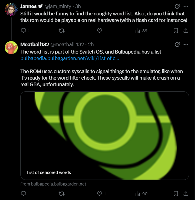 >>58988597>they literally added syscalls so the GBA game can call the OS to detect no-no words. They can also expand the list with updates:https://bulbapedia.bulbagarden.net/wiki/List_of_censored_words