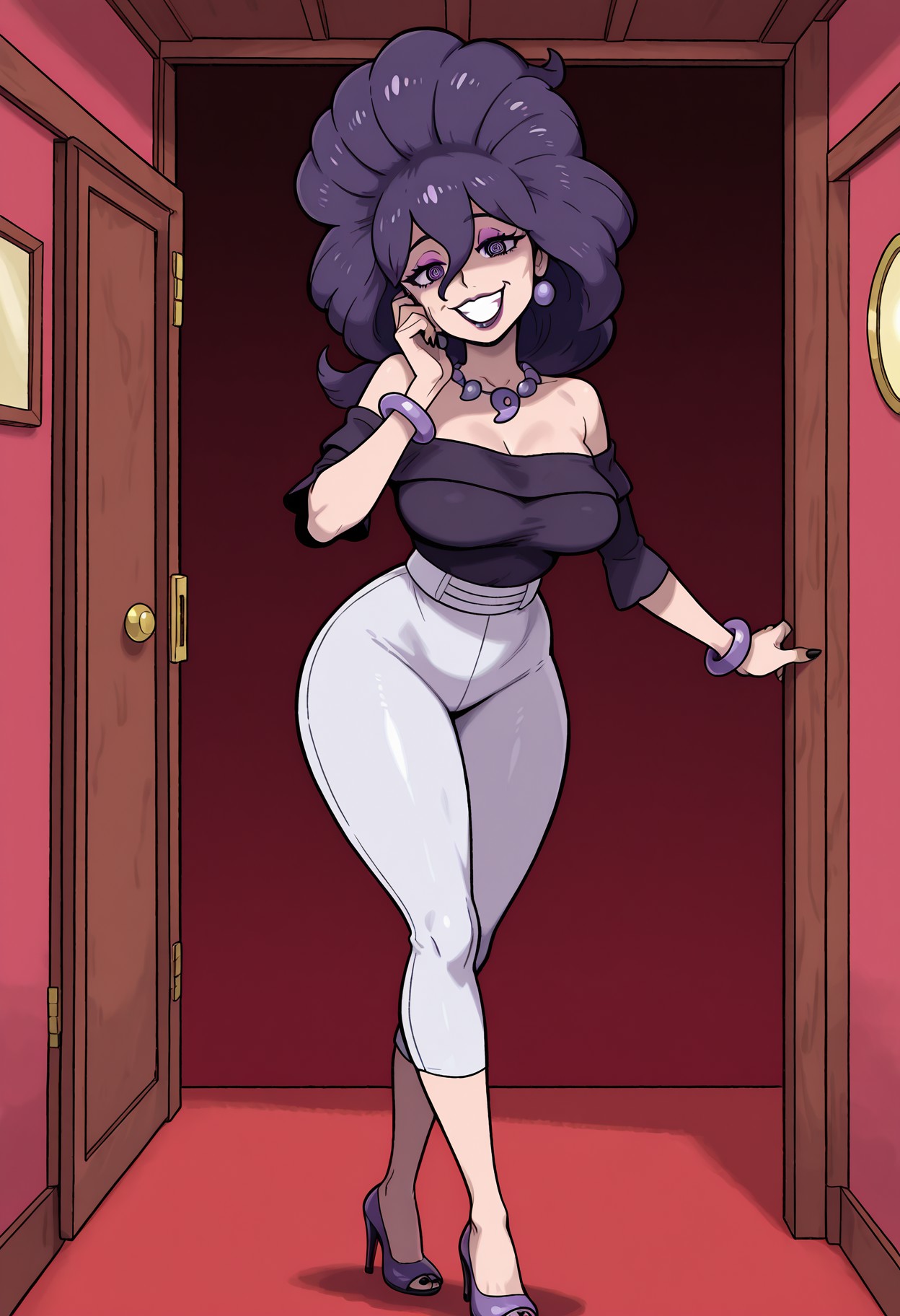 >>58997067>ZAfull body, official art, watercolor \(medium\):0.46, sugimori, jaggy lines:0.48, watercolor background, best quality, absurdres, female focus, parody, 1girl, solo, jewelry, off-shoulder shirt, collarbone, purple magatama necklace, medium breasts, big hair:1.3, sleeveless, (hex maniac plza|pegbundy:0.5), purple eyes, @ @,purple hair,low ponytail,hair between eyes,purple eyes,necklace, hand on own face, open mouth, walking towards viewer ,long hair, no outline dark-purple lipstick, purple bracelet, motherly, large breasts, shirt, makeup, bare shoulders, smile, off-shoulder shirt, dark-purple top, leopard print top, bangle, curly hair, toes, black toenails, mature female, wide hips:0.52, thick thighs:0.48, (purple footwear|peep toe heels, stiletto heels), tight pants rolled up to knees, long fingernails, black nail polish, head tilt, heavy makeup, pink eyeshadow, half-closed eyes, eyebags, seductive gaze, indoors, haunted house, gloomy atmosphere, deep red-painted wall sections with mahogany wood partitions,>Negative prompt (common):overexposed, poorly drawn face,poor facial details,poorly drawn hands,poorly rendered hands, deformed hands, low resolution,Images cut out at the top, left, right, bottom,bad composition,mutated body parts,blurry image,disfigured,oversaturated,bad anatomy,deformed body ,multiple legs, multiple arms, multiple hands,rear view,3d,watermark, sketch, worst quality, ahoge, feet out of frame, bad feet, poorly drawn hands, polydactyl, 6+fingers, blended fingers, 4 toed feet, blended toes, displaced digits, ankle straps,