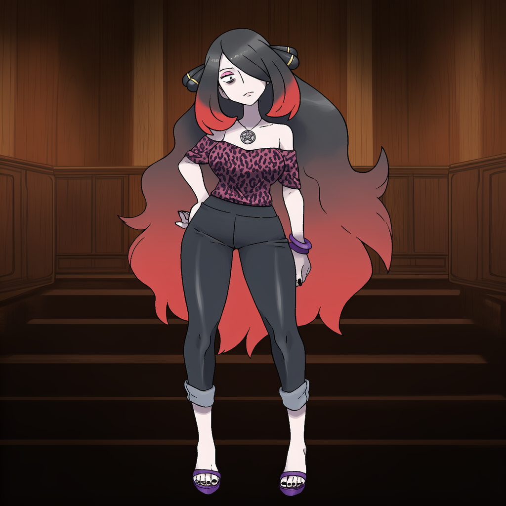>>58997060>RSEfull body, official art, watercolor \(medium\):0.46, jaggy lines:0.48, masterpiece,best quality,sugimori ken \(style\), long hair, black hair with red ends, gradient hair:0.34, absurdres, female focus, 1girl, solo, jewelry, off-shoulder shirt, collarbone, pentagram necklace, medium breasts, big hair:0.65, sleeveless, (hxmrs), sidelocks, wavy hair, sleepy eyes, bags under eyes, constricted pupils, closed mouth, expressionless, looking at viewer, purple bracelet, contempt, large breasts, bare shoulders, off-shoulder shirt, dark-purple top, leopard print top, dark-purple bangle, toes, black toenails, mature female, wide hips:0.52, thick thighs:0.48, (purple footwear|peep toe heels, stiletto heels), tight black pants rolled up to knees, long fingernails, black nail polish, head tilt, heavy makeup, pink eyeshadow, imposing atmosphere, indoors, haunted house, cursed atmosphere, mahogany wooden walls, dark brown walls, dark background in distance,