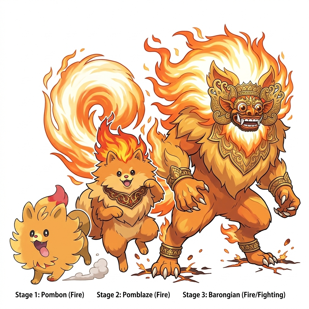 >>59004971If Pombon is a pure, fluffy Pomeranian, we should keep that signature "cloud of fur" energy while amping up the heat as it grows.Since we're in an Indonesia-inspired region, I’ve pivoted the designs to focus on the Barong Ket (the lion-like spirit) and Pencak Silat (traditional Indonesian martial arts).1. Pombon (Fire)The Fluff Ball PokémonA tiny Pomeranian with a flickering flame-shaped tuft on its head. It’s high-energy and surprisingly spicy for its size.2. Pomblaze (Fire)The Hearth PokémonThe Vibe: It grows larger and its mane becomes much more voluminous, resembling a flickering bonfire.The Indonesian Twist: It wears a decorative collar resembling traditional Balinese wood carvings. It begins standing on its hind legs during battle to practice striking with its front paws.3. Barongian (Fire/Fighting)The Guardian Spirit PokémonThe Vibe: A massive, bipedal Pomeranian "Lion" with a mane made of literal, flowing white-hot fire. It looks majestic, fluffy, and incredibly powerful.The Combat: It uses a "Dancer’s Style" of fighting, inspired by Pencak Silat. Its movements are fluid and rhythmic, but its strikes are explosive.The Look: It sports ornate, gold-trimmed "armor" fur patterns and a wide, grinning face typical of Barong masks, making it look both friendly and intimidating.Signature MoveSpirit Strike: A Fighting-type physical move that has a 30% chance to burn the target.Hidden AbilityFluffy: Halves damage from contact moves but doubles damage from Fire-type moves (which it resists anyway!).